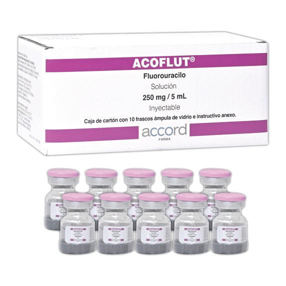 Está indicado para el tratamiento paliativo de carcinomas de colon, de recto, de estomago, de páncreas y cáncer de mama, carcinomas de vejiga, de prostata, de ovario, cervical, endometrial y de pulmón en pacientes clasi cadas como incurables por medio quirurgicos o con otras formas de tratamiento. También se puede utilizar vía intraarterial en tumores de cabeza, cuello y de hígado y por vía intracavitaria en derrames malignos pericardicos, pleurales y peritoneales. ACOFLUT Sol. Iny. c/10 FCOS. AMP.