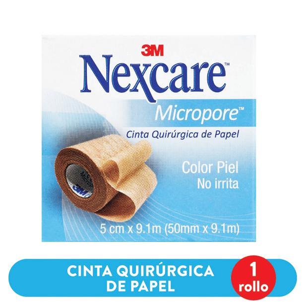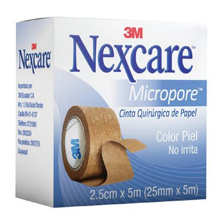 Fórmula: Cinta adhesiva de papel microporosa, hipoalergénica, color piel, rollo individual, Ancho: 2.5cm (1"); Largo: 10m.