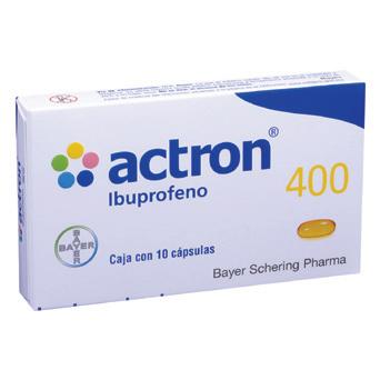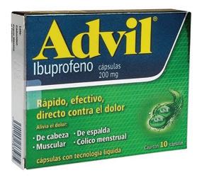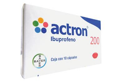 Genérico: Ibuprofeno Alivia el dolor, disminuye la ebre. Indicado en el dolor de cabeza, de oidos o dental; dolor premenstrual; dolor de espalda, torceduras y contusiones.
