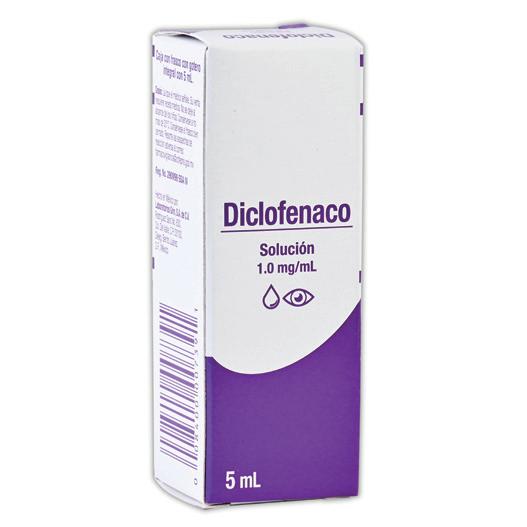 Indicación Terapéutica: El diclofenaco oftálmico solución se usa para tratar el dolor, enrojecimiento e hinchazón de los ojos en pacientes que se están recuperando de una operación quirúrgica por cataratas (procedimiento para tratar el opacamiento de la lente en los ojos). También se usa para aliviar momentáneamente el dolor de los ojos y la sensibilidad a la luz en los pacientes que se están recuperando de una cirugía refractiva de la córnea (operación quirúrgica para mejorar visión).
