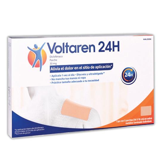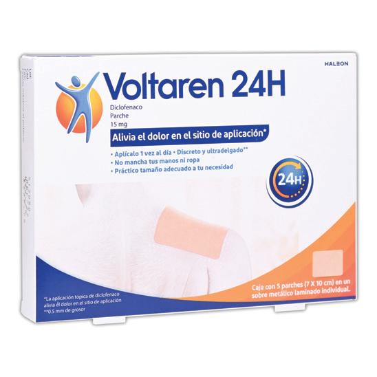 VOLTAREN 24H PARCHE Cja. c/5 Pzs. 7x10 CM. 15 MG. Cada parche de 7x10cm contiene: Diclofenaco sódico 15mg.