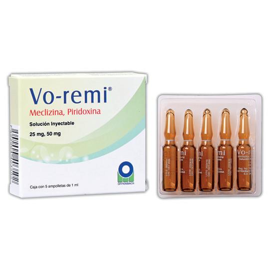 Indicación Terapéutica: Para la pro laxis y el alivio sintomático de la náusea, del vómito y del vértigo. Cada ampolleta contiene: Clorhidrato de Meclizina 25mg+Clorhidrato de Piridoxina 50mg/1ml.