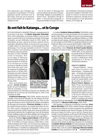 SI UN KATANGAIS A MARQUÉ l’histoire contemporaine de la province et du pays, c’est Moïse Kapenda Tshombé. Né en 1919 à Musumba, cet homme d’affaires entre en politique et prend la tête de la Convention nationale du Katanga (Conakat), un parti fédéraliste fondé en 1958. Après l’indépendance du pays, opposé au Premier ministre Patrice Lumumba, Tshombé proclame la sécession de la province le 11 juillet 1960 et, le mois suivant, est élu président de l’État du Katanga. C’est à lui que Lumumba est livré le 17 janvier 1961 ; il assiste à son exécution. Lorsque les Casques bleus des Nations unies écrasent la sécession, en 1963, Tshombé s’exile en Espagne. Rentré au Congo en 1964 pour devenir Premier ministre du gouvernement de coalition, il est révoqué un an plus tard par le président Joseph Kasa-Vubu alors qu’il vient de remporter les législatives. Nouvel exil. Le 30 juin 1967, Tshombé reprend le chemin du pays lorsque son avion est détourné vers Alger, où il est incarcéré et où il meurt le 30 juin 1969. Ci-dessus: Moïse Tshombé, alors Premier ministre, en Autre personnalité mar1965. Ci-contre : Vincent de quante, Jason Sendwe, Paul Lunda Bululu en 1980; leader du parti Balubakat. il est aujourd’hui sénateur. Allié de Lumumba, il s’opposa fermement à la sécession en lançant une rébellion. Élu président de la province du Nord-Katanga en 1963, il fut assassiné en 1964. Godefroid Munongo (1925-1992), numéro deux de la Conakat et bras droit de Tshombé, fut son ministre de l’Intérieur durant la sécession du Katanga puis, en 1964, au sein du gouvernement central. Ministre des Affaires étrangères du Katanga sécessionniste, Évariste Kimba fut quant à lui nommé Premier ministre par Joseph Kasa-Vubu en octobre 1965, après le limogeage de Tshombé. Il ne resta en fonction qu’un mois, l’armée ayant pris le pouvoir. Kimba est resté dans la mémoire des Congolais pour avoir été le premier homme politique pendu sur la place publique (avec deux de ses compagnons), sous Mobutu, pour tentative de coup d’État. Neveu de Tshombé, Nguz a Karl-i-Bond (1938-2003) fut plusieurs fois ministre des Affaires étrangères (1972, 19761977, 1979-1980) et Premier ministre (1980-1981 et 19911992) de Mobutu Sese Seko. Lors de l’ouverture démocratique d’avril 1990, il avait créé un parti d’opposition, l’Union des fédéralistes et républicains indépendants (Uferi), avant de se rapprocher à nouveau du chef de l’État.
