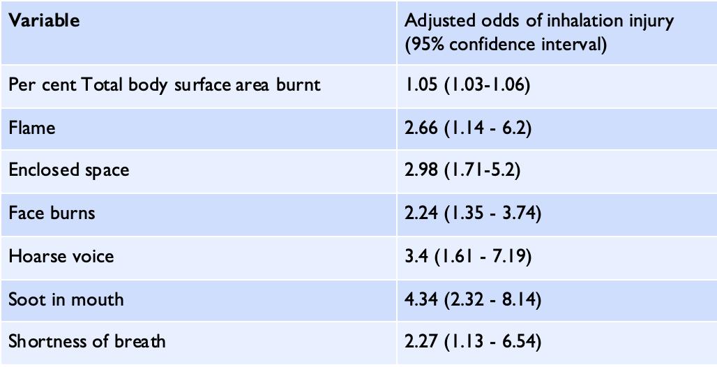 The importance of human factors in airway management is not new and in the management of major trauma, clear communication is a key precondition for Table 1: Predictors of inhalation injury in Burns Patient.13