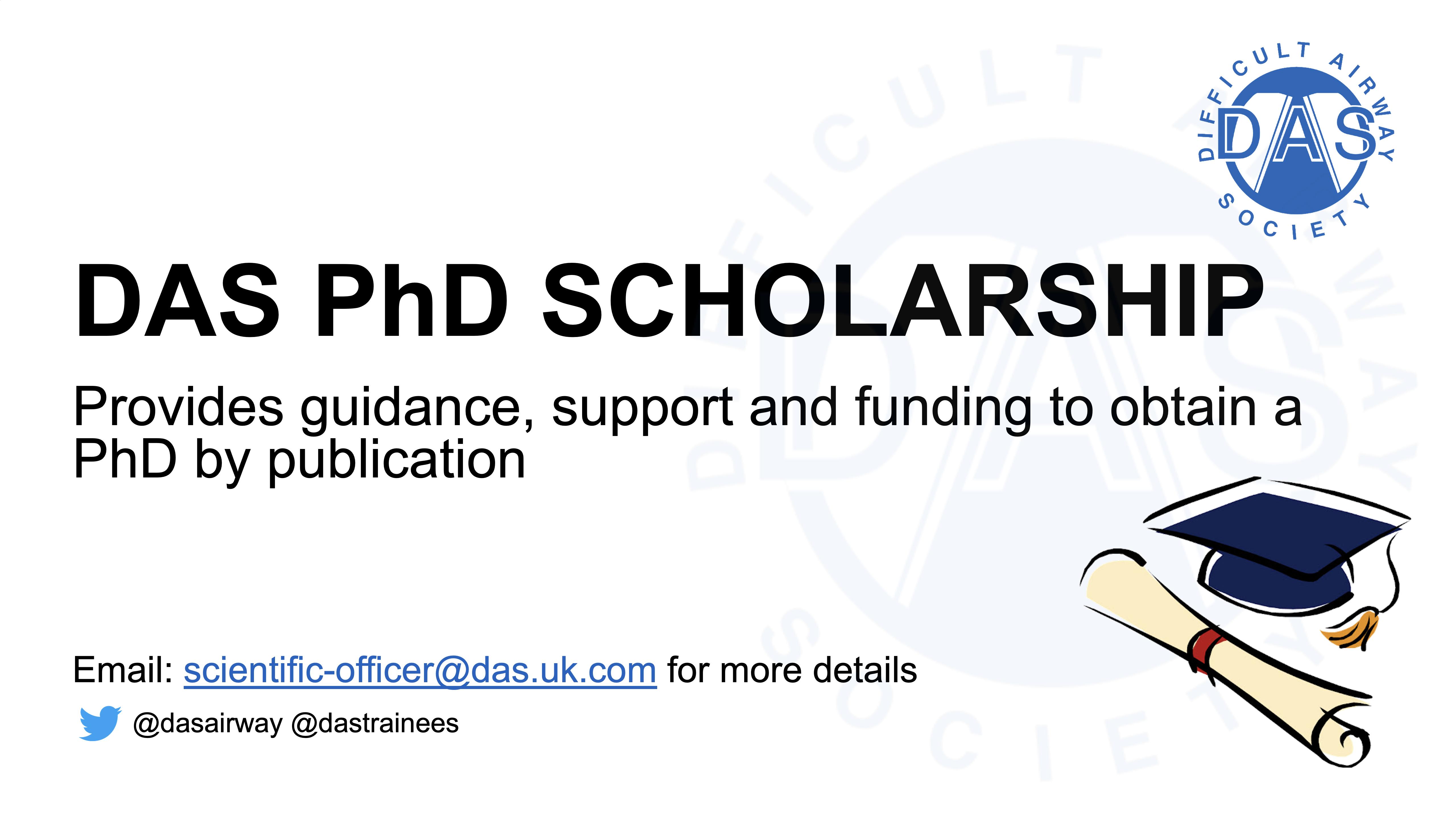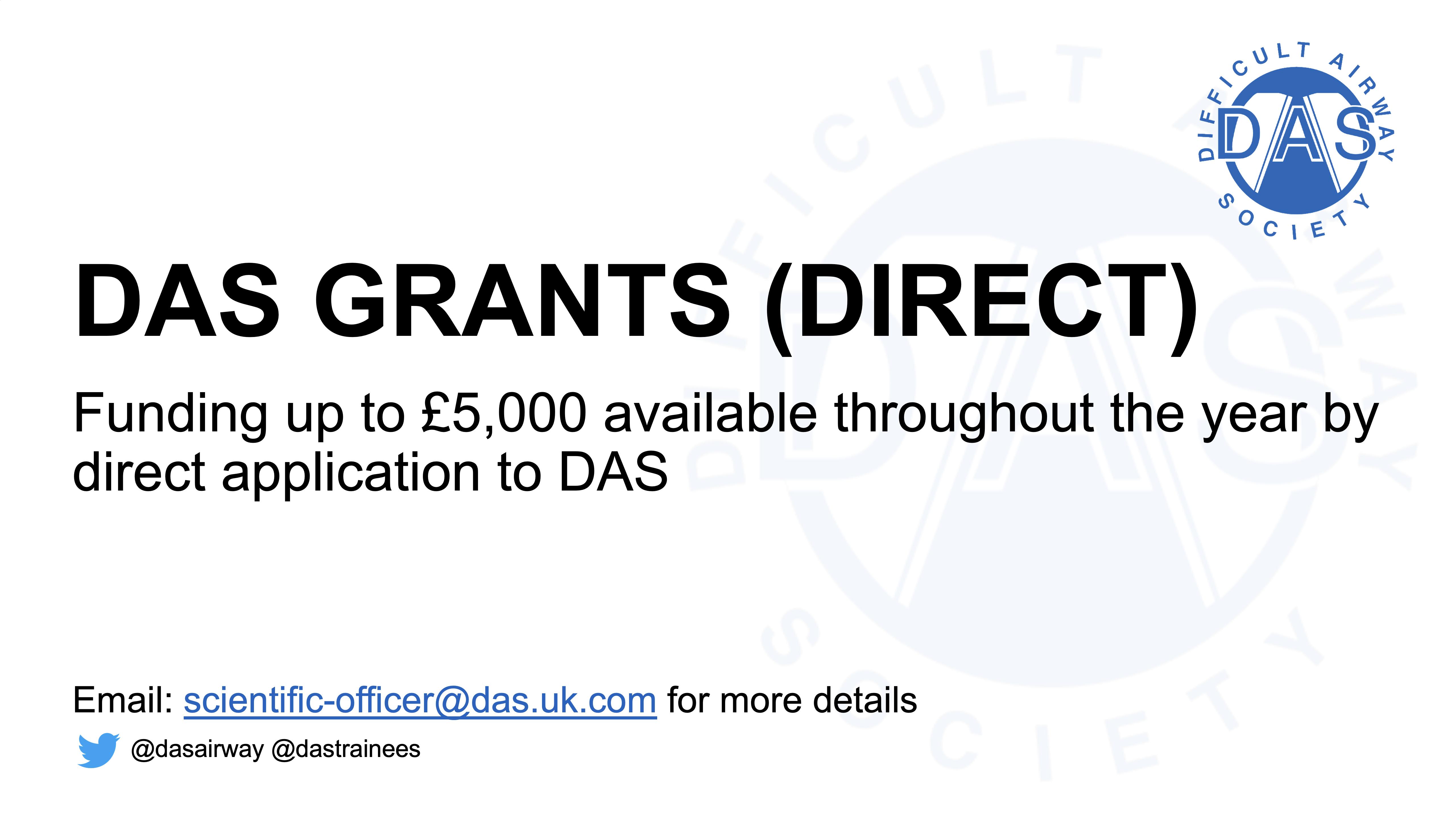 1. Direct DAS Grants. To ensure continuity and sustainability of grass-roots airway management research, we have a rolling process of grant funding via direct application to DAS. Applications for funding of up to £5,000 for studies broadly related to airway management will be peerreviewed. Further details are available on the DAS website or by contacting me directly. We have already had a number of applications, and we hope to receive more. Reach out for more information on this today!