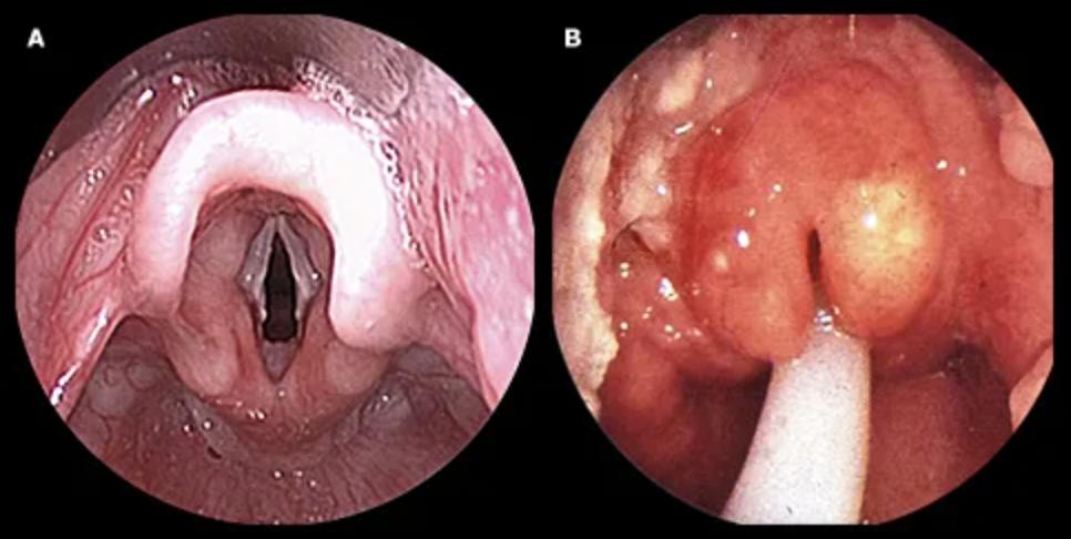 A: normal airway, compared to B: swollen epiglottis in the context of epiglottitis. Image credit: UpToDate http:// uptodate.com