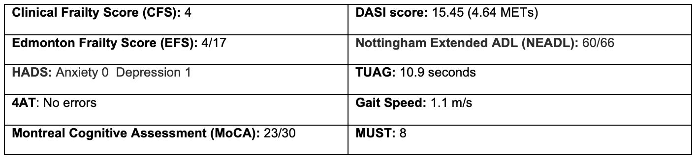 The effect of baseline cognition and delirium on long-term cognitive impairment and mortality: a prospective population-based study - The Lancet Healthy Longevity – Tsui et al. – 2022 27. MoCA-Test-English_2009 (mocatest.org) – MoCA pdf Exercise Tolerance: 28. A brief self-administered questionnaire to determine functional capacity (The Duke Activity Status Index)ScienceDirect – Hlatky - 1989 29. Integration of the Duke Activity Status Index into preoperative risk evaluation: a multicentre prospective cohort study - ScienceDirect - Wijeysundera et al - 2020 30. A simplified (modified) Duke Activity Status Index (M-DASI) to characterise functional capacity: a secondary analysis of the Measurement of Exercise Tolerance before Surgery (METS) study - British Journal of Anaesthesia (bjanaesthesia.org.uk) – Riedel et al - 2021