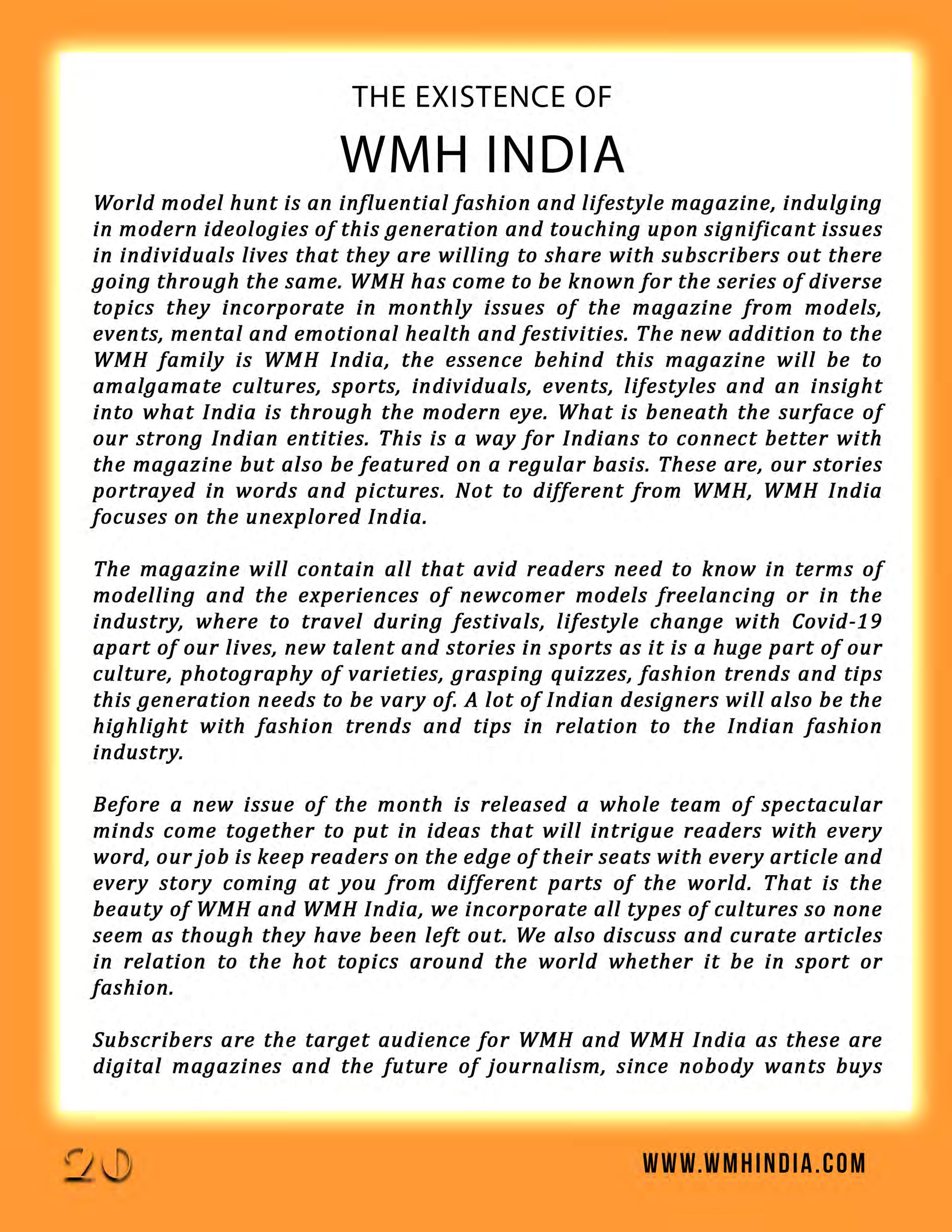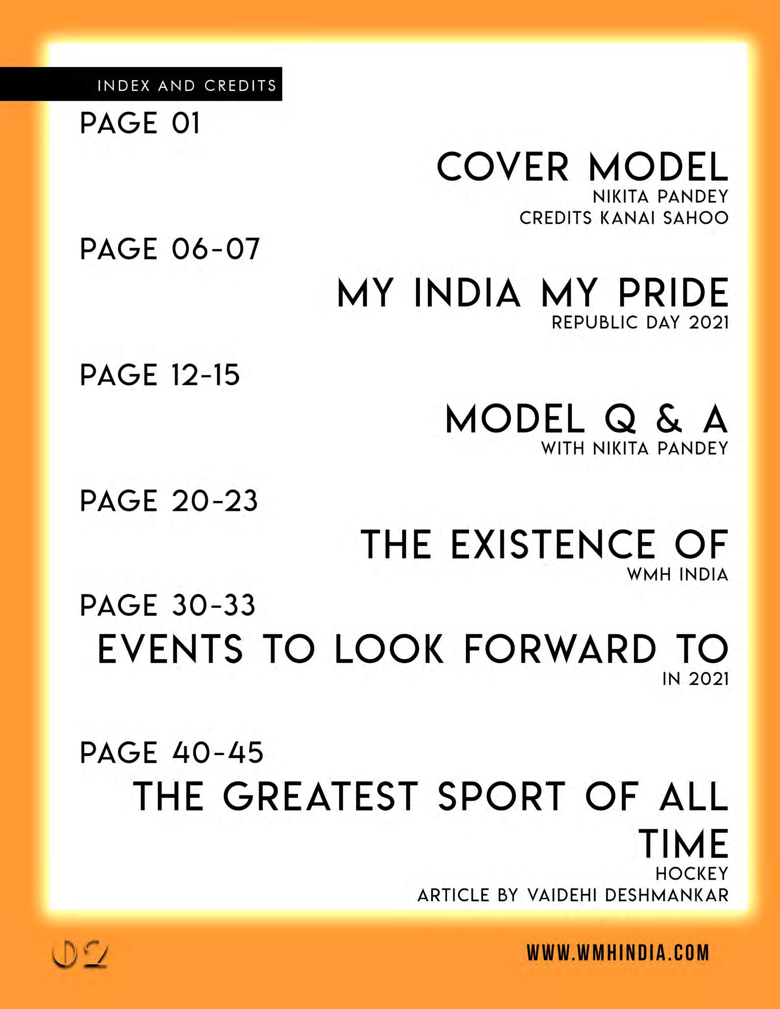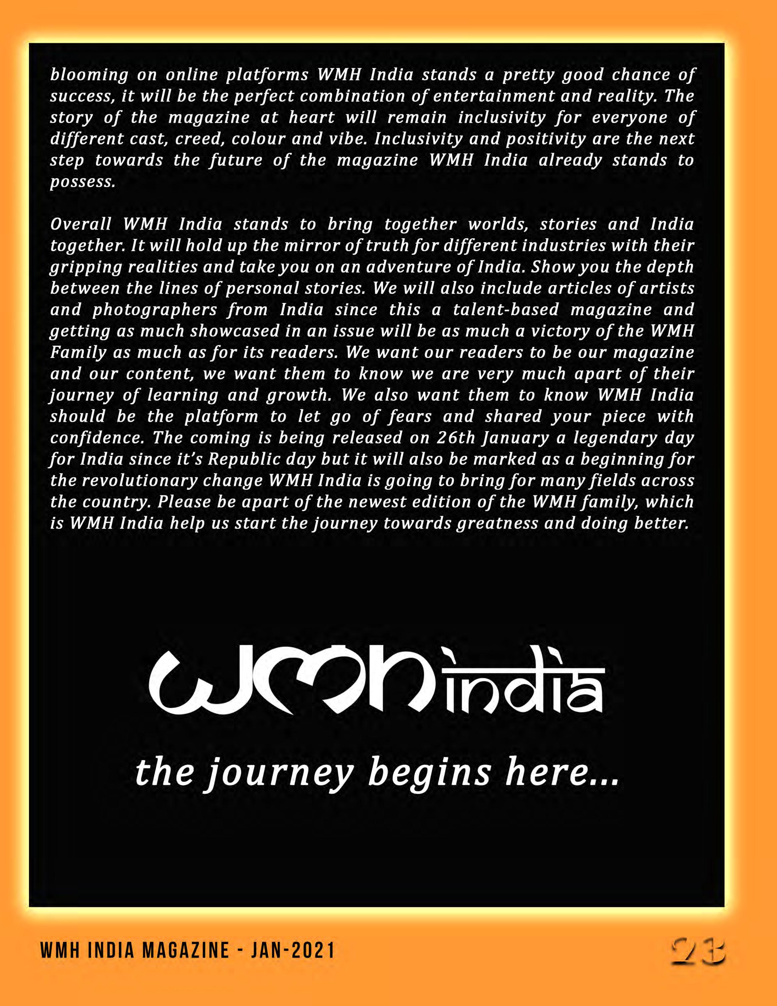 This month's edition of WMH-India centers on the theme of My India My Pride since it is Republic day. Introducing Nikita Pandey, our cover girl for this month. While she is a beginner, her confidence is everything when it comes to modeling. This self-confident person does not back down from any challenge and is prepared for success in life. We convey all the important information in this magazine, which might provide a glimpse of what to expect in the future.