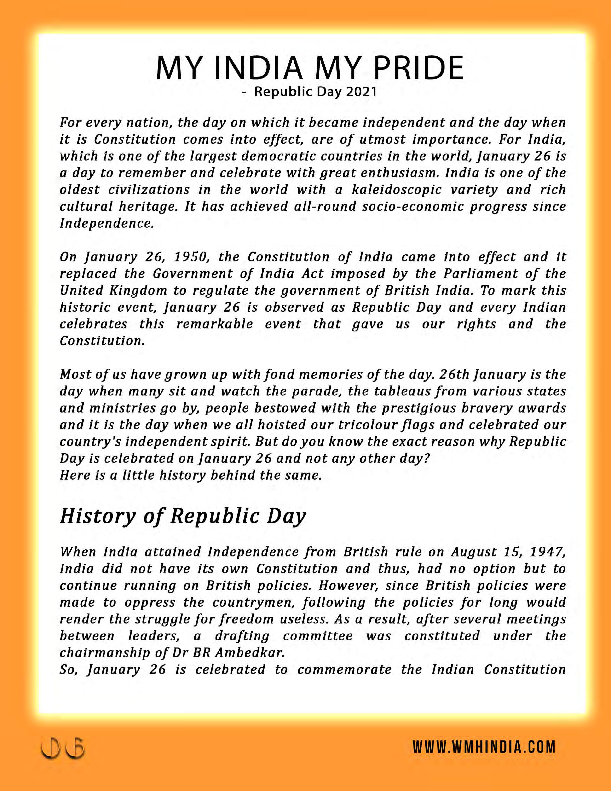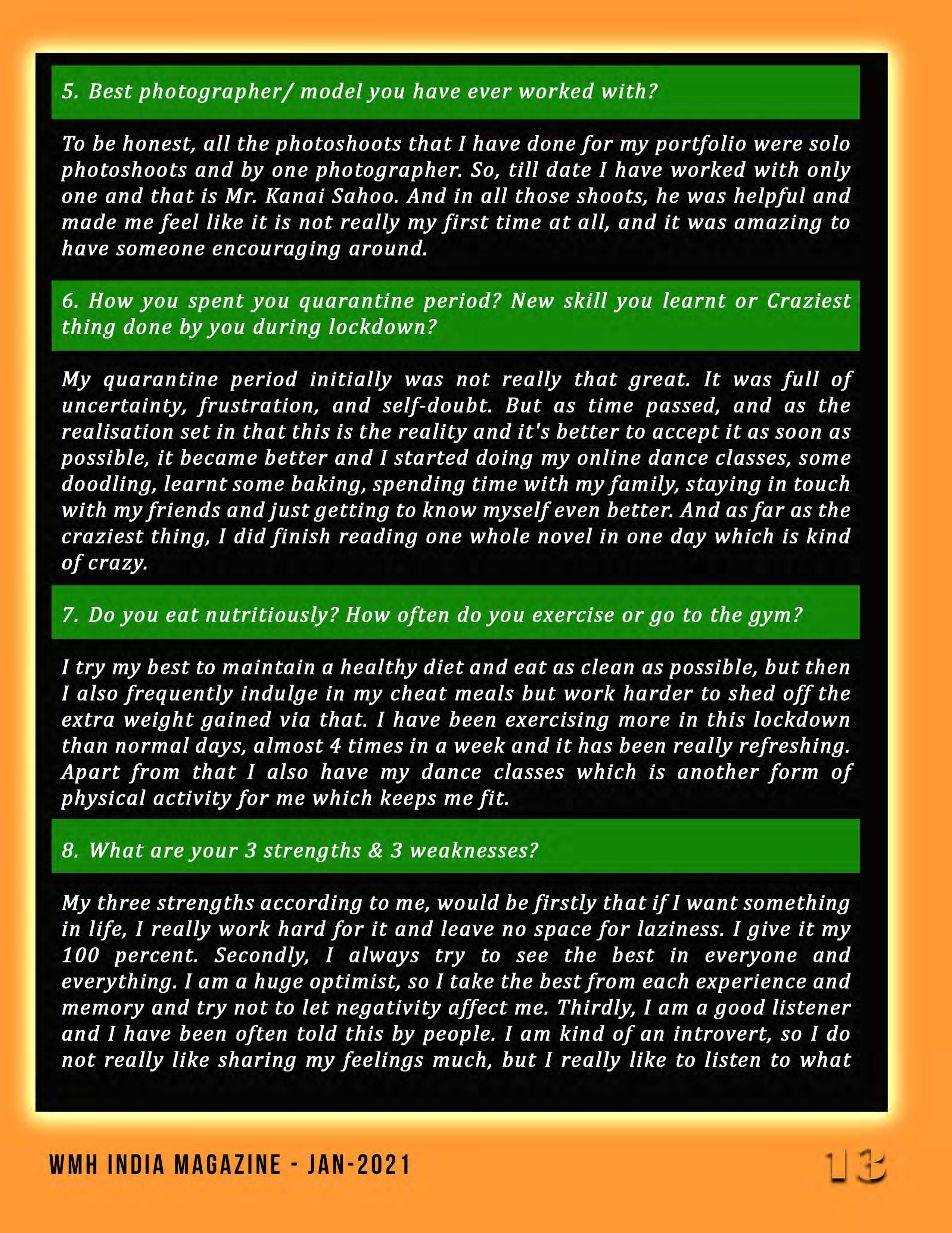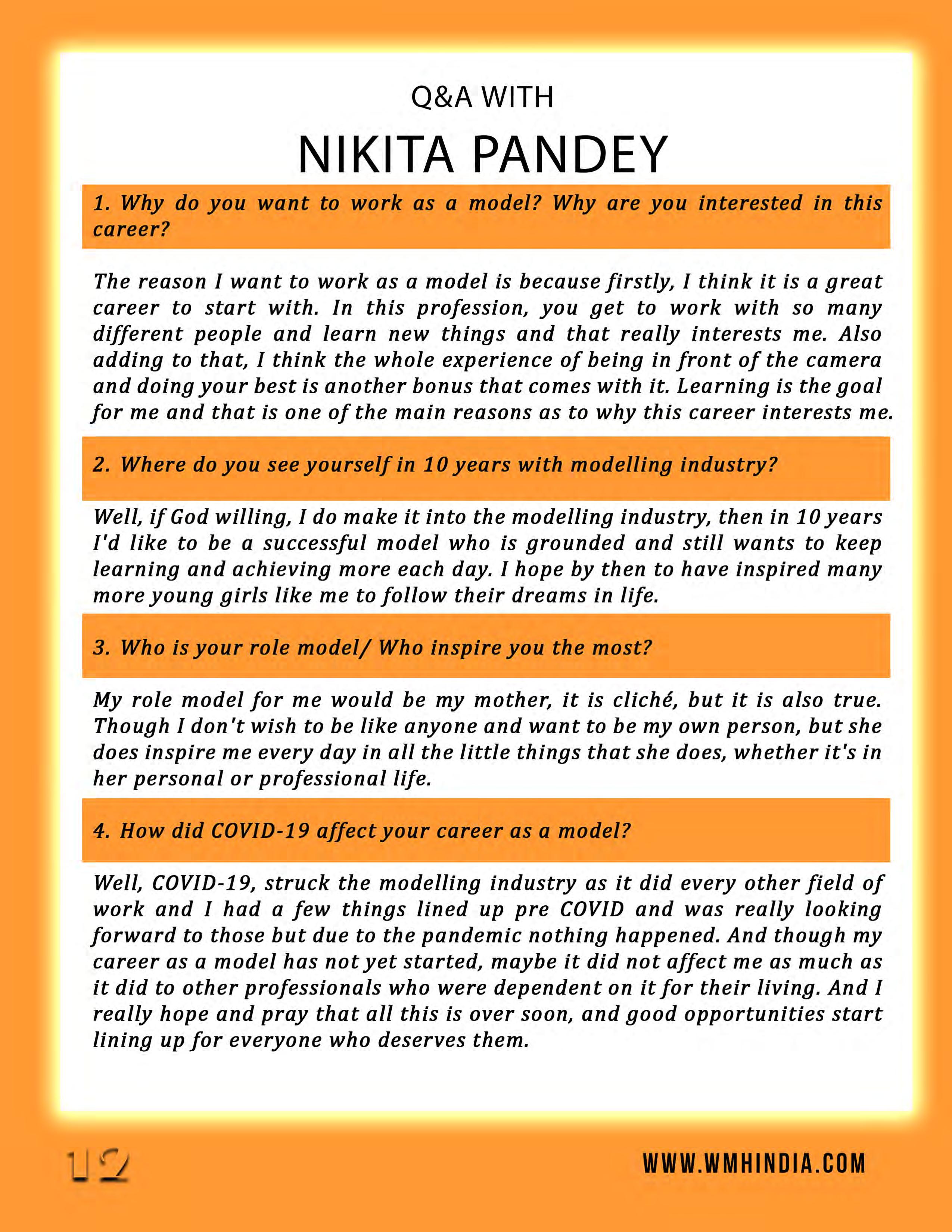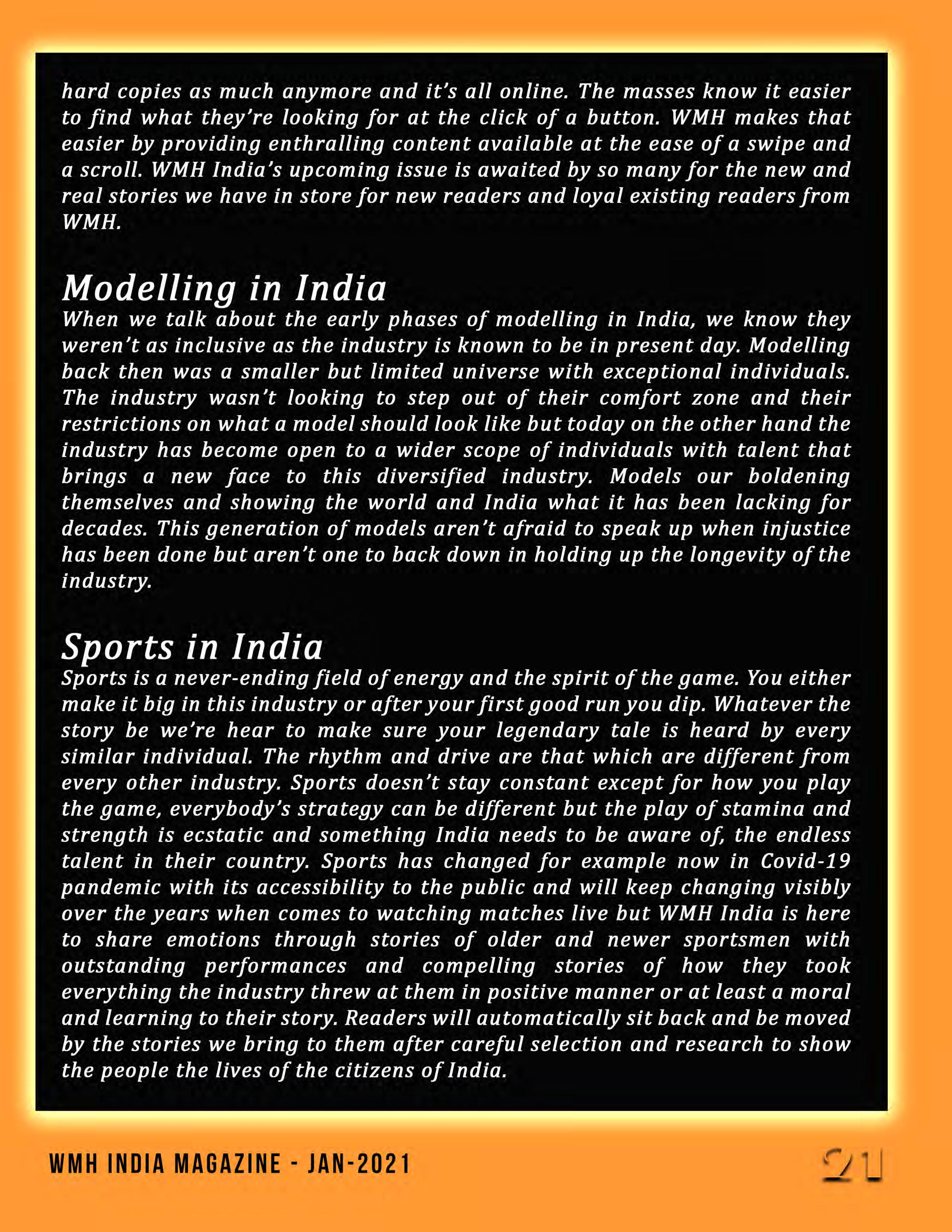 This month's edition of WMH-India centers on the theme of My India My Pride since it is Republic day. Introducing Nikita Pandey, our cover girl for this month. While she is a beginner, her confidence is everything when it comes to modeling. This self-confident person does not back down from any challenge and is prepared for success in life. We convey all the important information in this magazine, which might provide a glimpse of what to expect in the future.