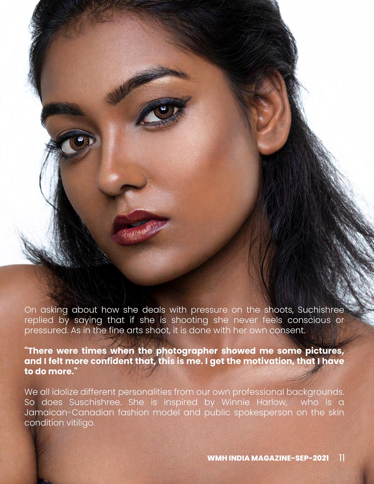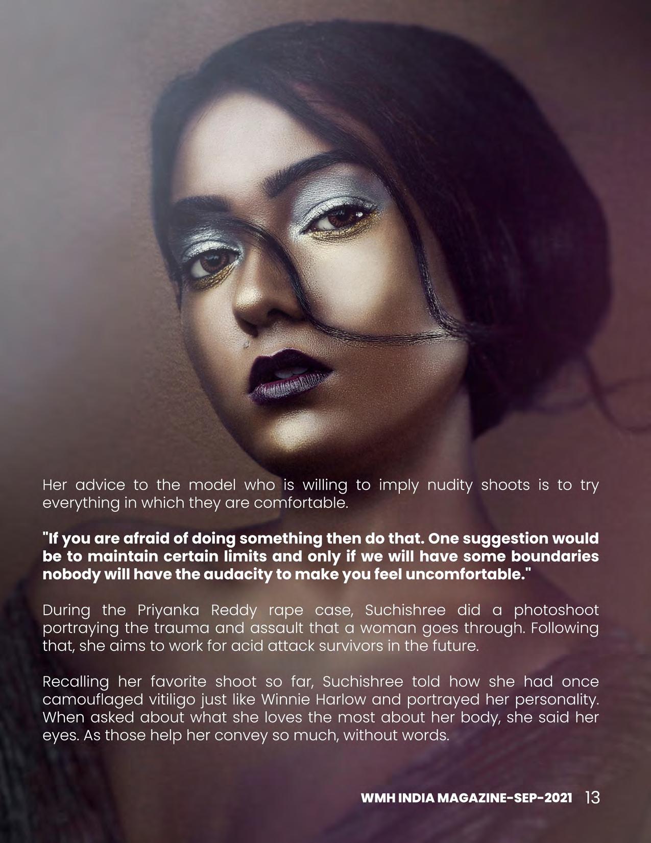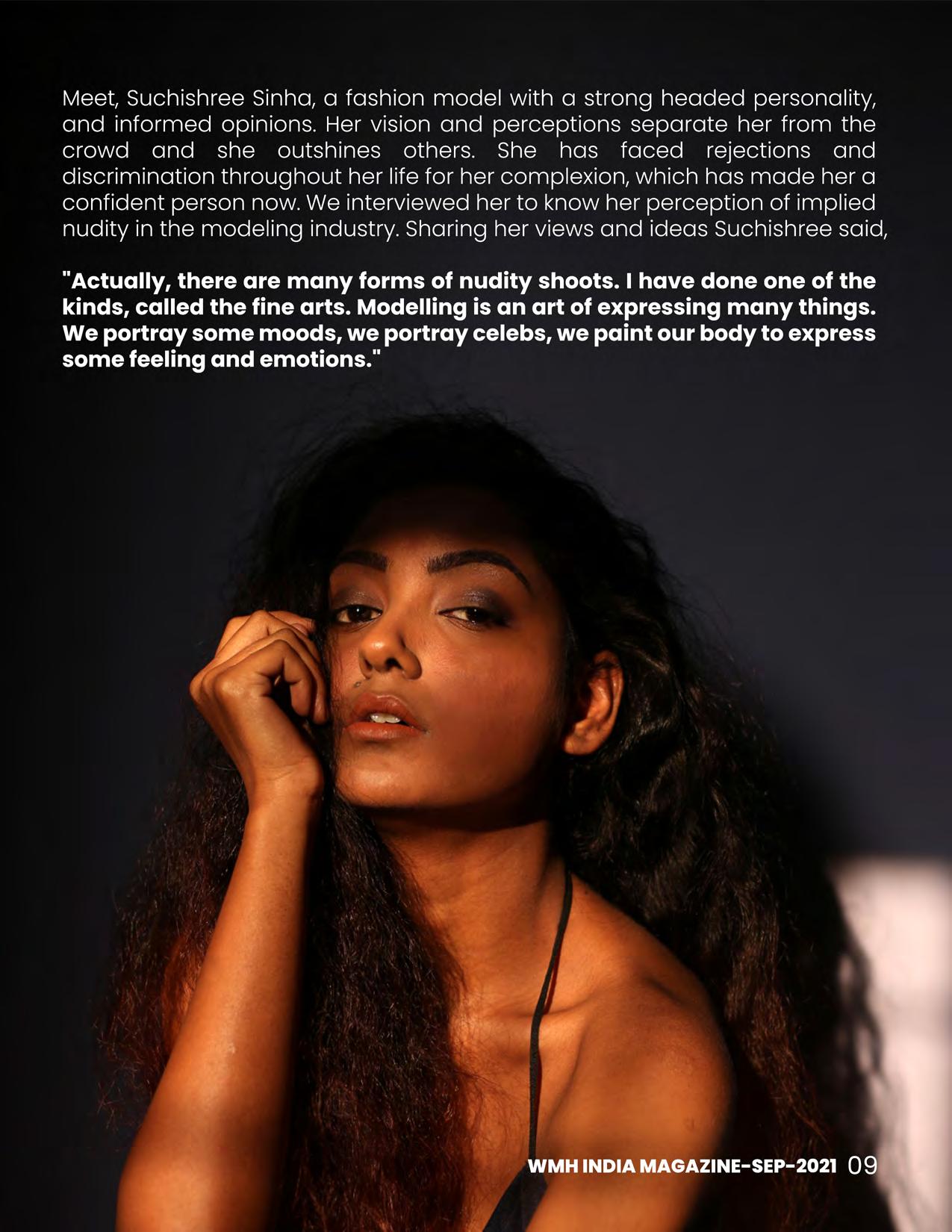 A new edition of WMH-India's monthly magazine focuses on implied nudity in the realm of modelling. This edition of the magazine features Suchishree Sinha on the cover. Over the course of her life, she has been rejected for her skin tone and faced discrimination, which affects her mental peace, but she did not let that stop her, and now she is embarking on her journey. With a confident personality and a wide range of opinions, she is a model to be reckoned with. There are many unknown things that are discussed in this magazine that will give you a profound understanding of modelling as an art of expression.