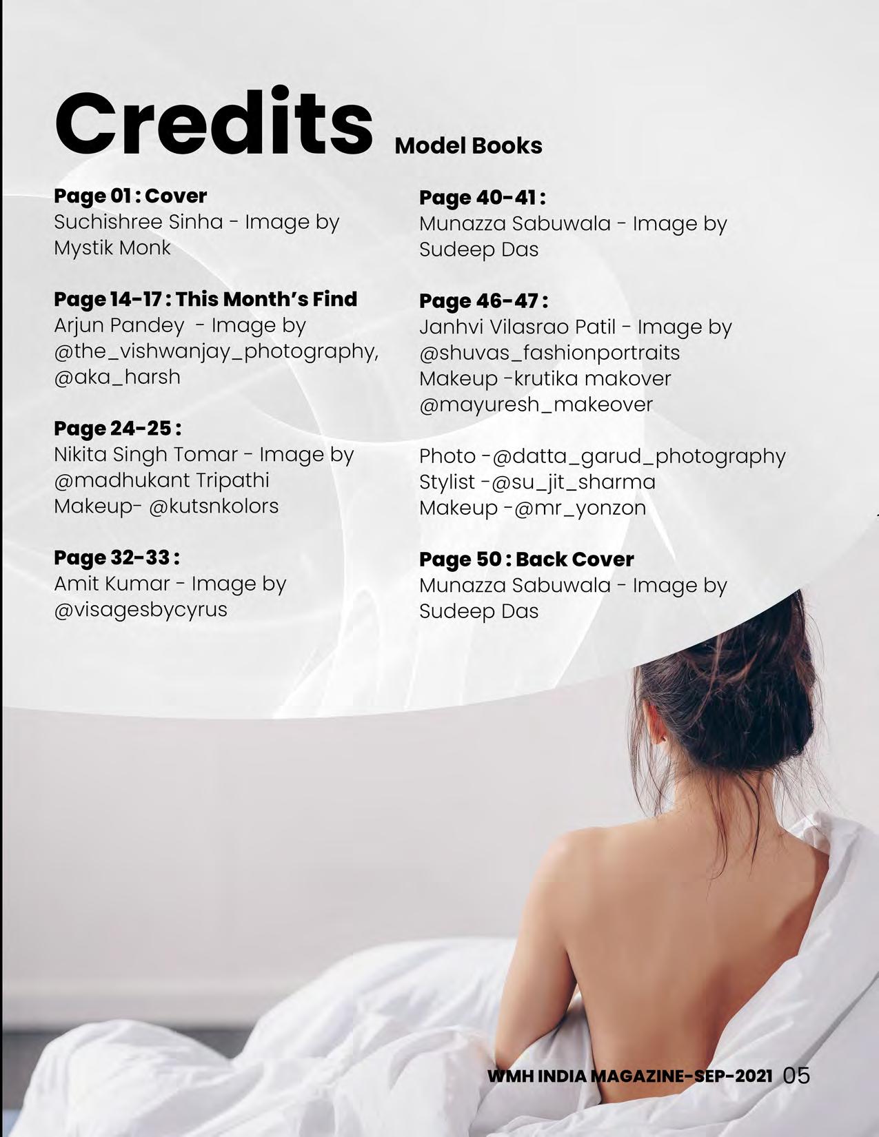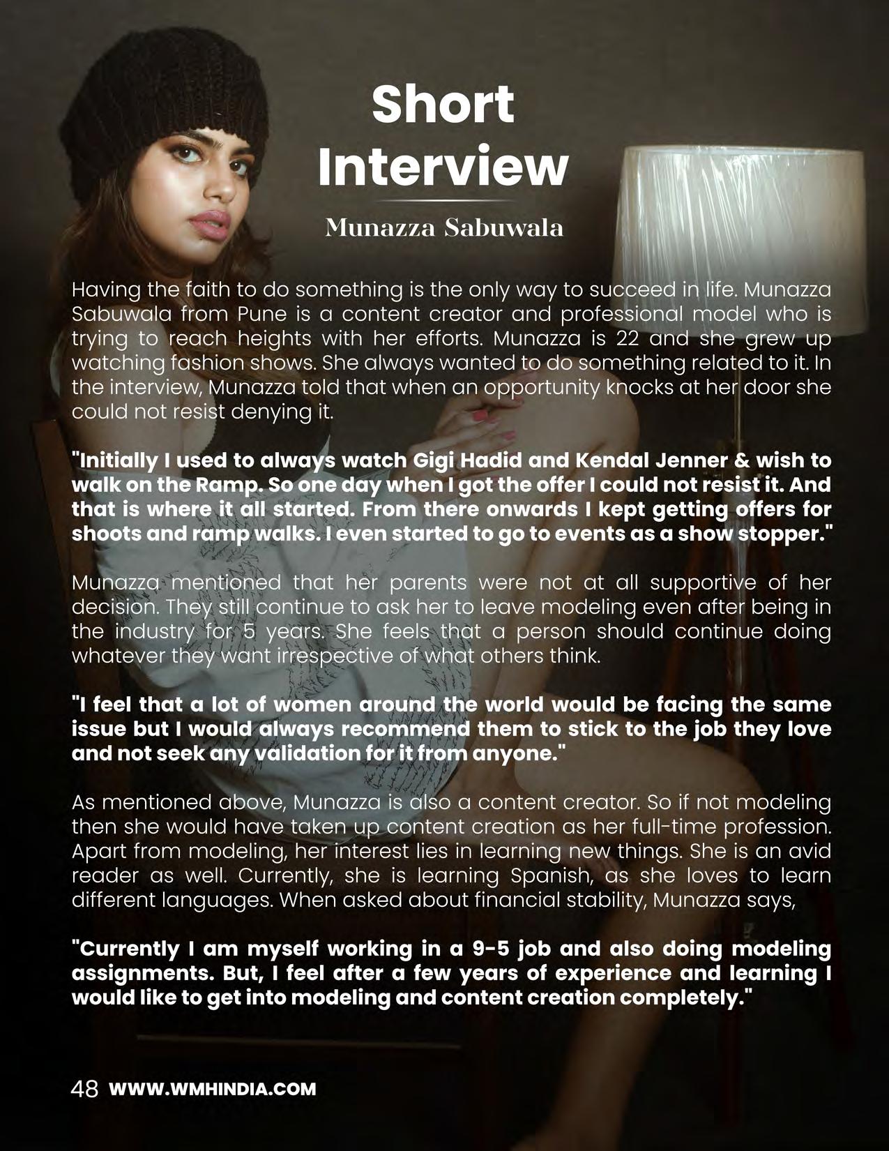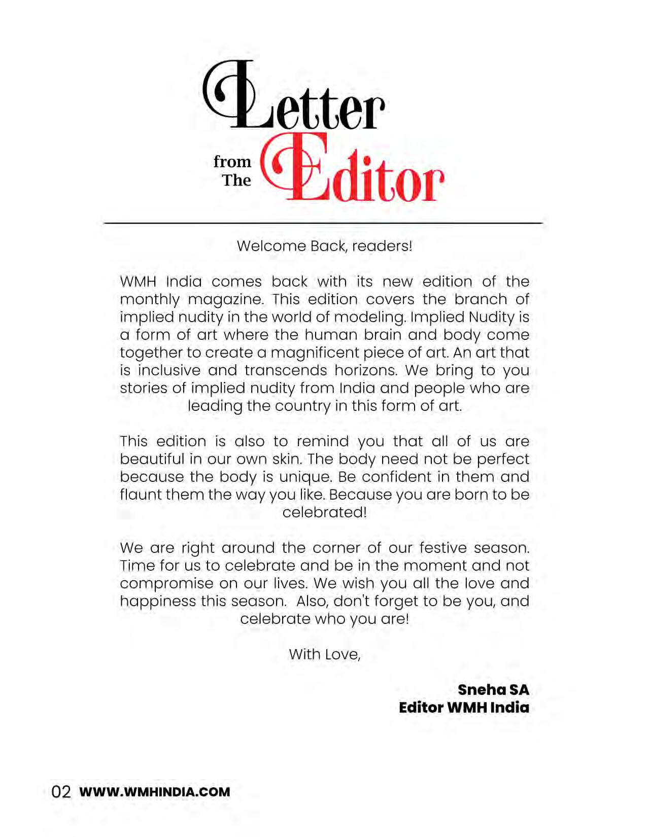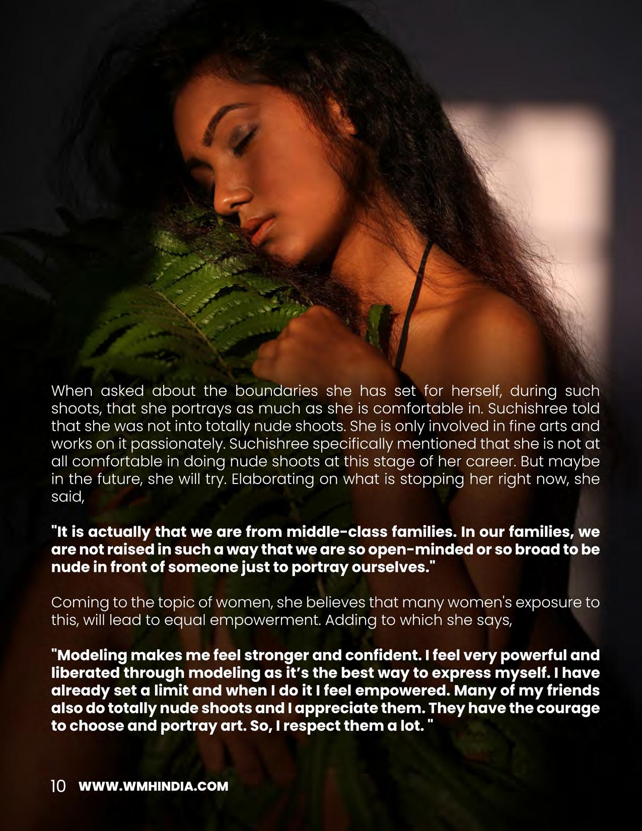 A new edition of WMH-India's monthly magazine focuses on implied nudity in the realm of modelling. This edition of the magazine features Suchishree Sinha on the cover. Over the course of her life, she has been rejected for her skin tone and faced discrimination, which affects her mental peace, but she did not let that stop her, and now she is embarking on her journey. With a confident personality and a wide range of opinions, she is a model to be reckoned with. There are many unknown things that are discussed in this magazine that will give you a profound understanding of modelling as an art of expression.