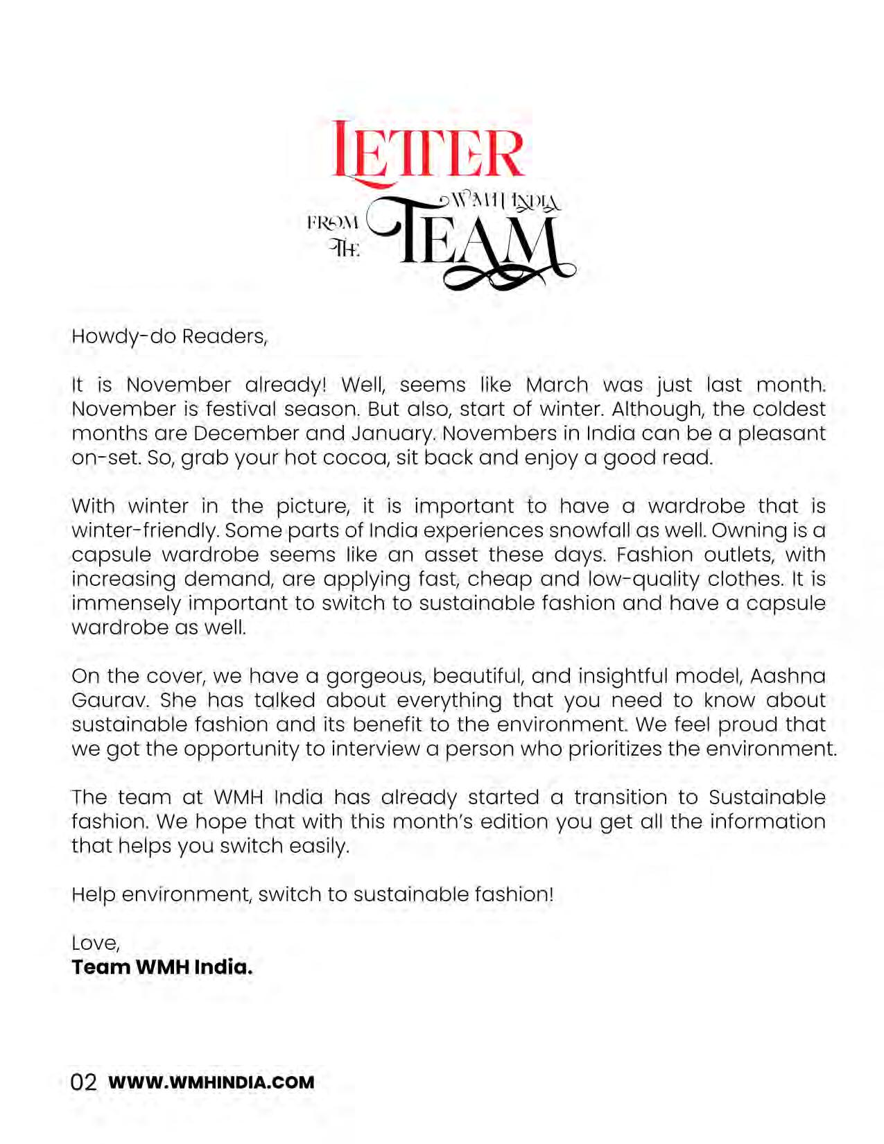 With this edition of WMH India, we highlight the very important aspects of Winter Styles and Winter Wardrobe. This month's cover feature is Ashna Gaurav. This issue of WMH focuses on providing insight into the benefits of capsule wardrobes, with Ashna Gaurav sharing her views on sustainable fashion. Also included in this edition is a section devoted to sustainable fashion, including pioneering brands that support it.