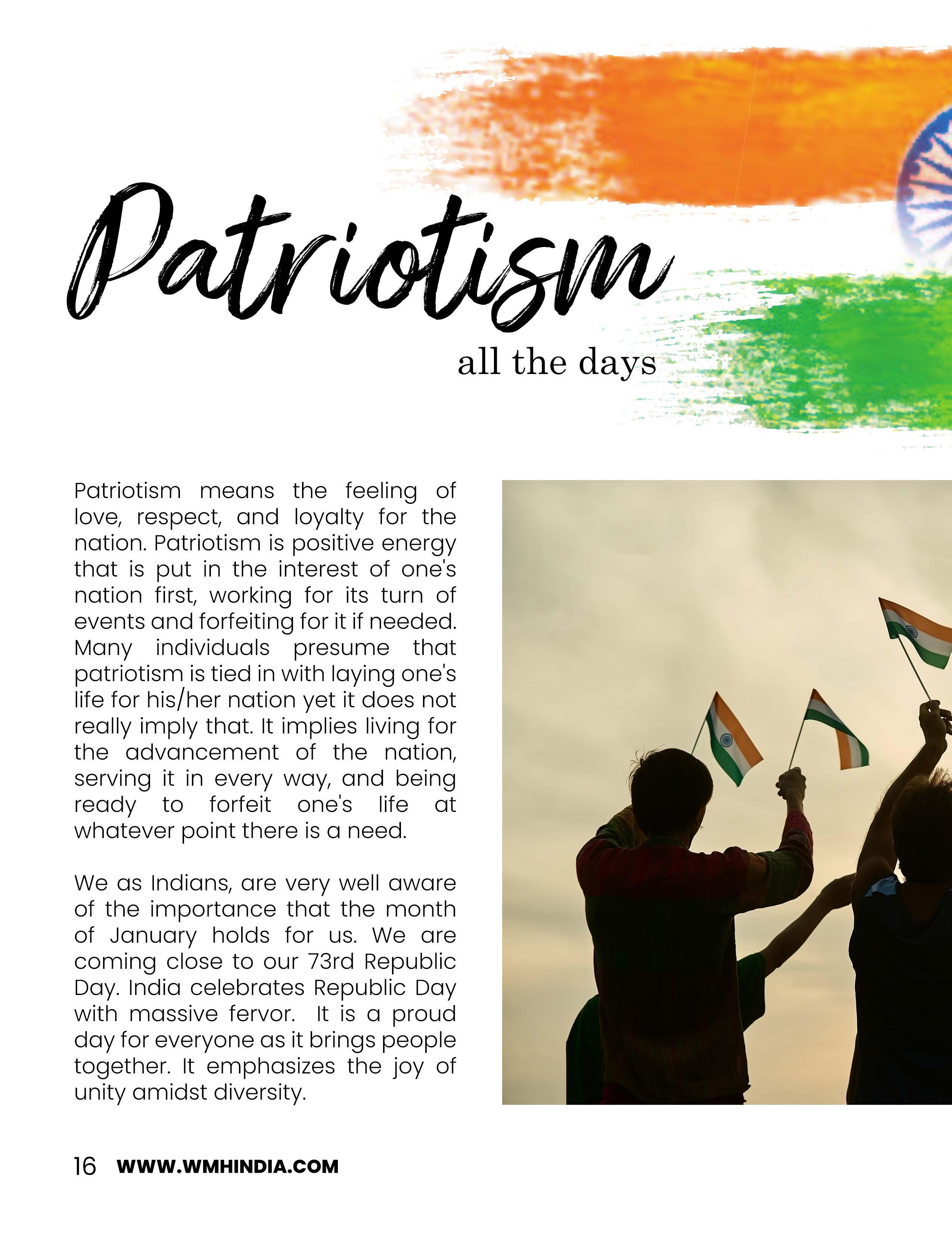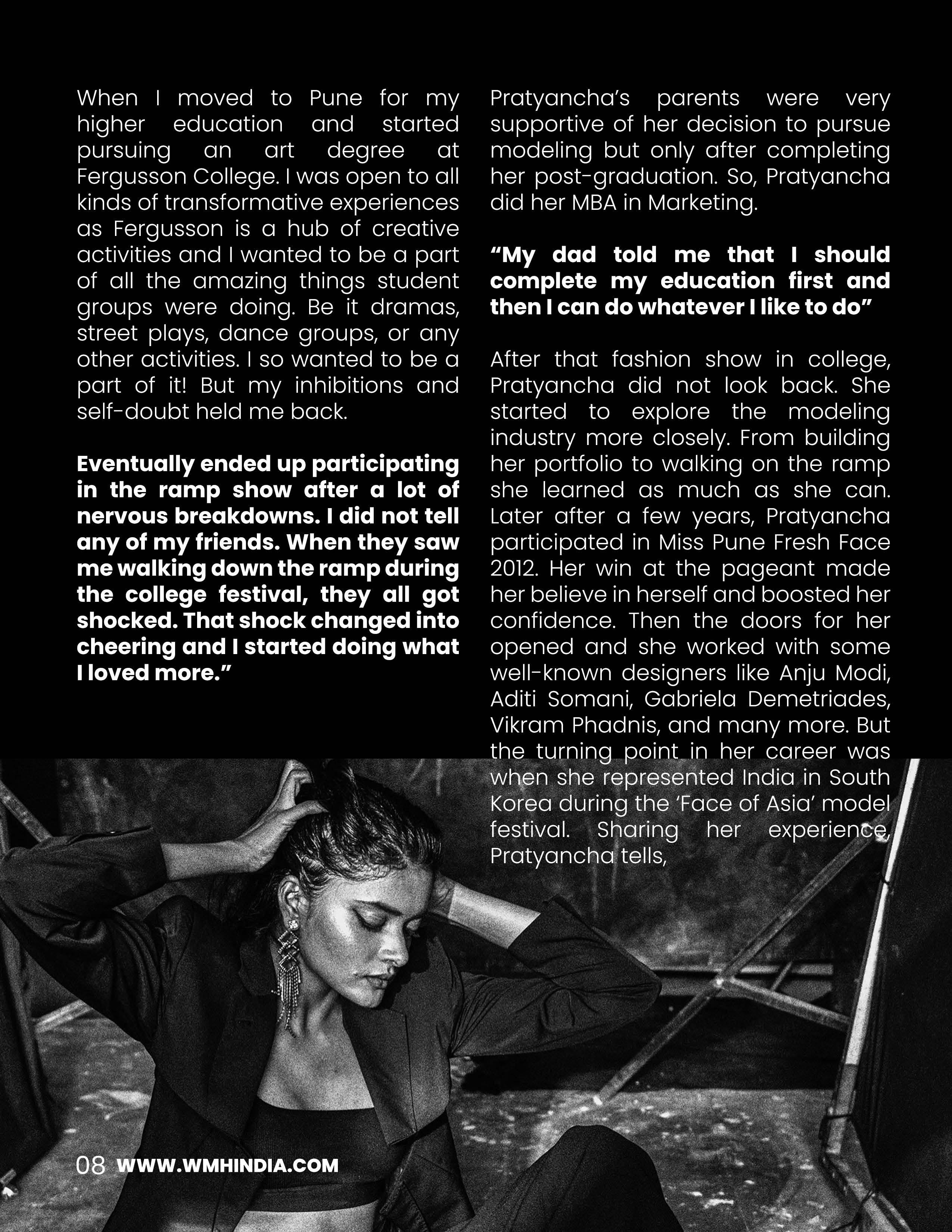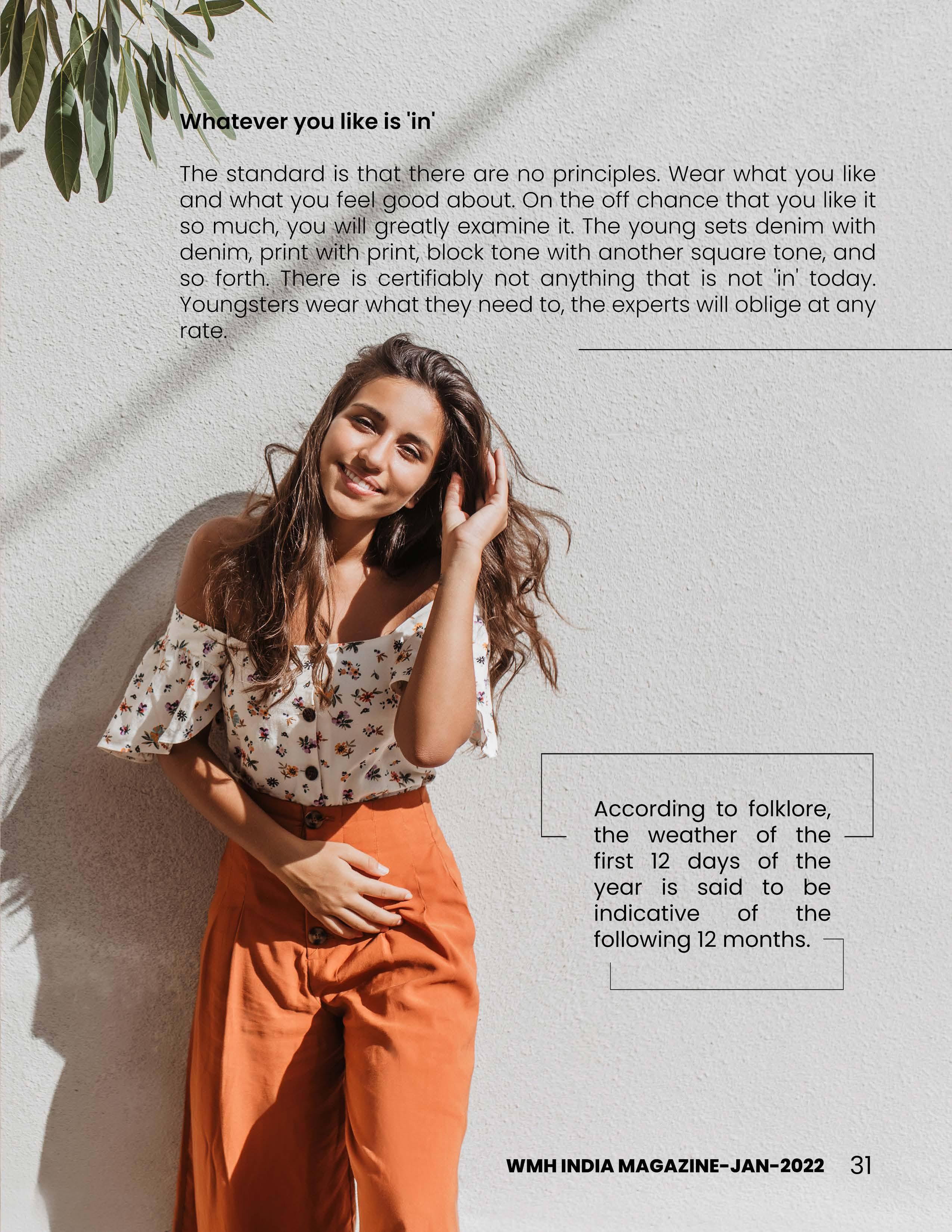 WMH-India’s January 2022 magazine edition is special because this month we celebrate India’s 73rd Republic Day. From amazing models to resolutions for you to take this new year we have it all sorted. We bring to you this month’s cover model Pratyancha Narale. Her story of how she overcame her inhibitions is worth reading. She’s a strong young woman who when decided to not let her insecurities take over never looked back and now is touching skies. With endless insights and facts, we have got together a whole package for you which you will eventually unfold with this edition.