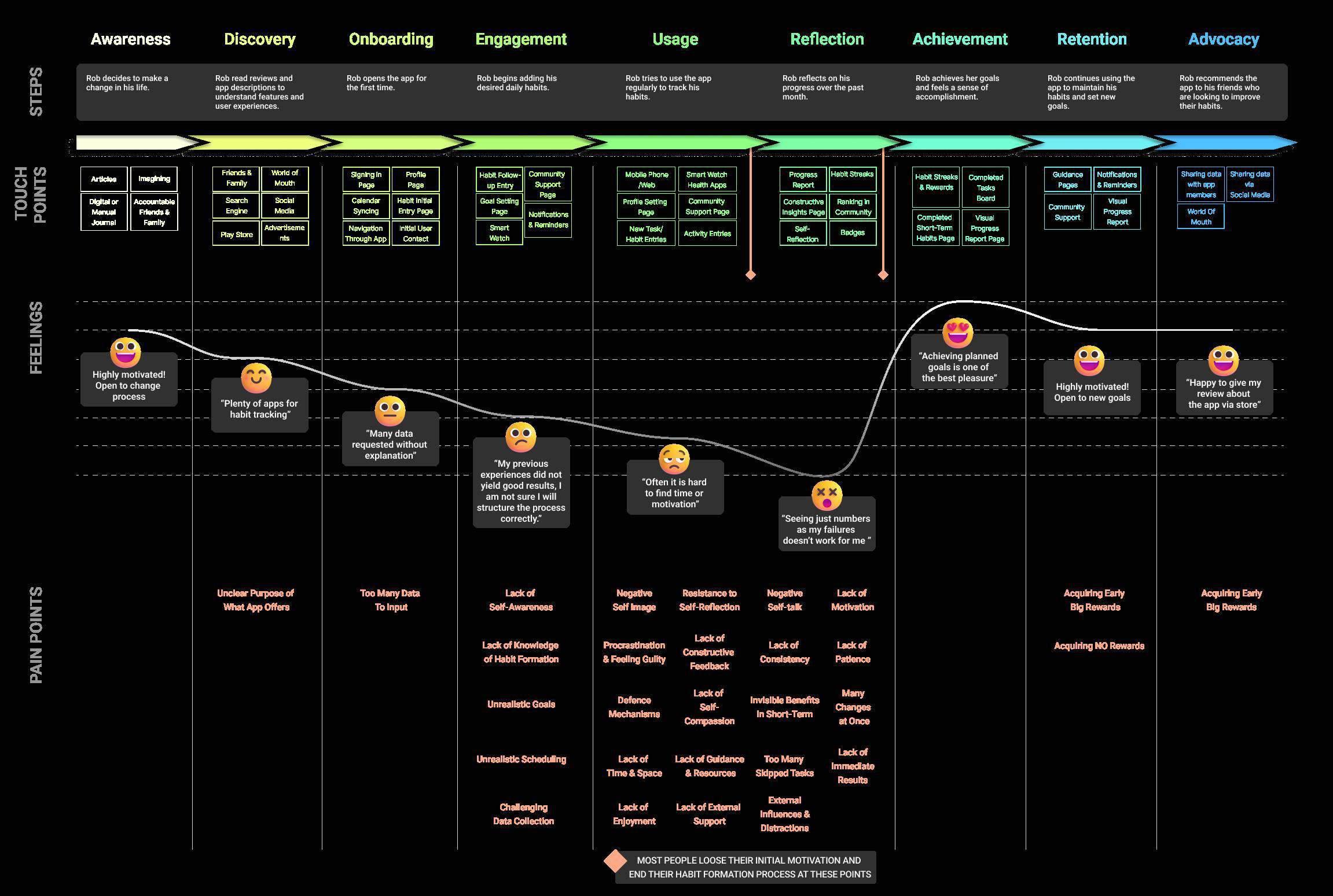 Taking a closer look into potential opportunities of Usage, Reflection/Motivation and Achievement stages with the Successful Habit Formation Diagram makes easier to comprehend that which opportunities is needed for specific steps.