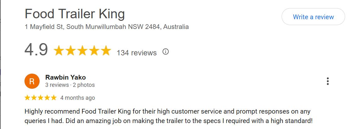 Highly recommend Food Trailer King for their high customer service and prompt responses on any queries I had. Did an amazing job on making the trailer to the specs I required with a high standard!