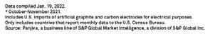 China touches almost all of the world’s graphite along its path to the consumer. The U.S. imported 64,396 tonnes of refined graphite between January and November in 2021, of which 73.3% came from China, according to data from Panjiva, a supply chain-focused business line of Market Intelligence. Even when graphite is mined or manufactured outside of China, such as from Mozambique, it is typically routed to China for processing and refinement. And most graphite refined in places such as Japan comes from China.