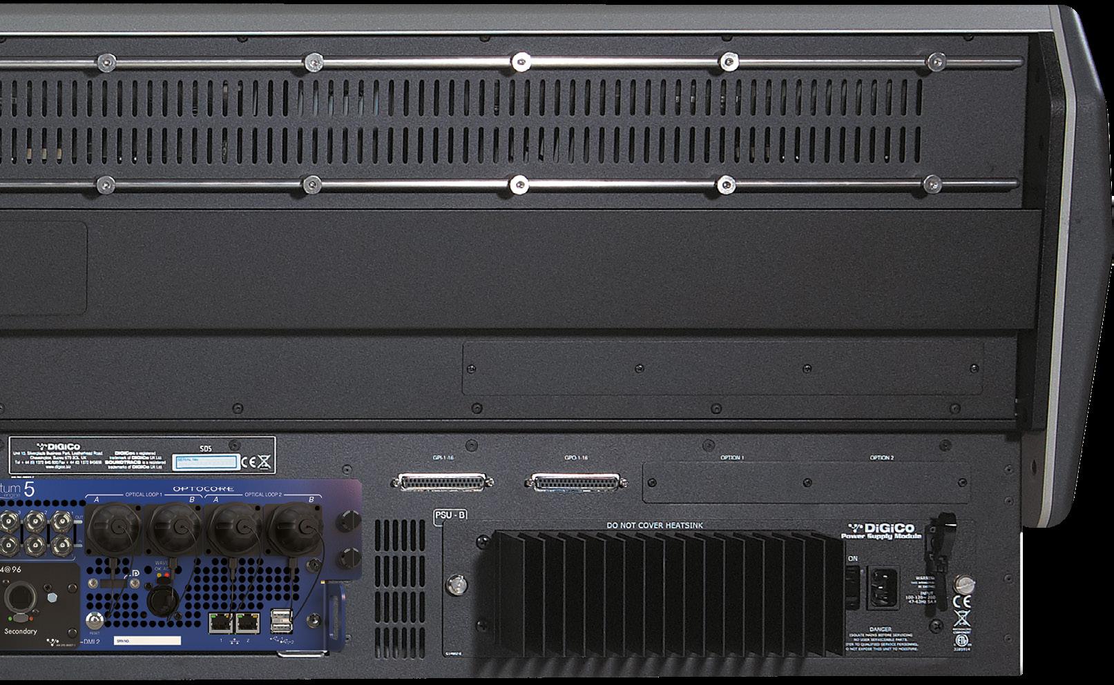 Double redundant MADI I/O (which can also be configured as 4 MADI I/O at 48kHz), dual DMI card slots, support for dual 2nd generation Optocore loops, built-in UB MADI USB interface, 2 GPIO, MIDI, 4 switched network ports, USB, and a digital Overview Monitor Output. Plus you can add a Waves SoundGrid Interface card giving you an extra 64 I/O for connecting to the SoundGrid Network. And that’s not all. The Quantum225 offers 8 analogue mic inputs, 8 analogue line outputs and 2 AES I/O (4 channels).