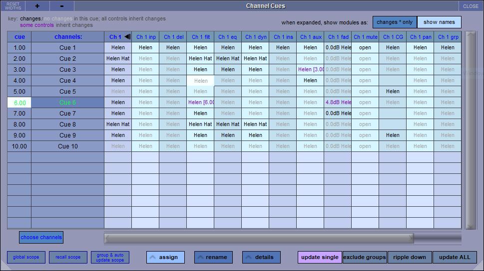DiGiCo’s Theatre software offers the most sophisticated and advanced auto-update cue system on the market. Users can choose exactly which parameters are updated throughout the cue list and apply separate rules for custom groups of channels. This means that Principals could follow one set of rules and the band channels follow another. It also offers exclusions for those instances where different settings need to be recalled only for one cue, and a comprehensive system for keeping track of all these changes throughout the cue list and making changes as and when they are needed.