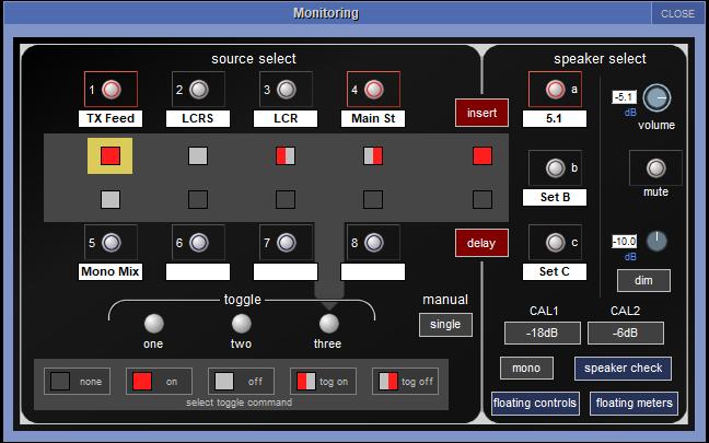 The 48x6 Monitor Matrix allows operators to monitor up to 8 full 5.1 surround sources through up to 3 different speaker setups. The Monitor Matrix also offers speaker inserts, delays, level calibration, quick select buttons and the ability to completely customise the upmixing and downmixing rules.