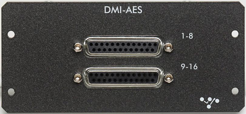 This card provides 16 inputs (8 pairs) and 16 outputs (8 pairs) on 2 x 25 way “D” connectors. All AES inputs are provided with sample rate conversion (SRC) by default. All AES outputs are synchronised to the mixer system clock.