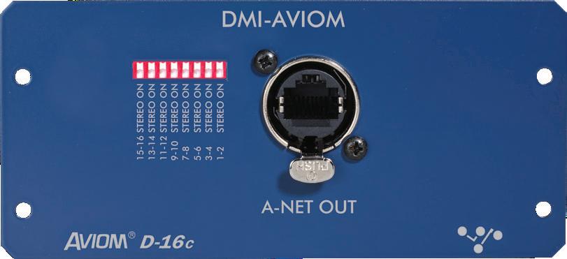 This card provides 16 output channels at 48kHz (with SRC) and supports Aviom’s proprietary A-Net Pro16 protocol. It has 1 CAT5E connection and faceplate DIP switched for Stereo output selection.