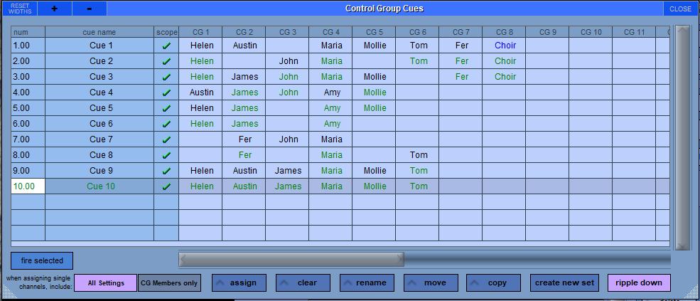 When programming Theatre shows the assignment of CG members is a vital part of a smoothly running show. The Control Group Cues panel allows for quick assignment of CG members throughout the cue list with its spreadsheet style workflow.