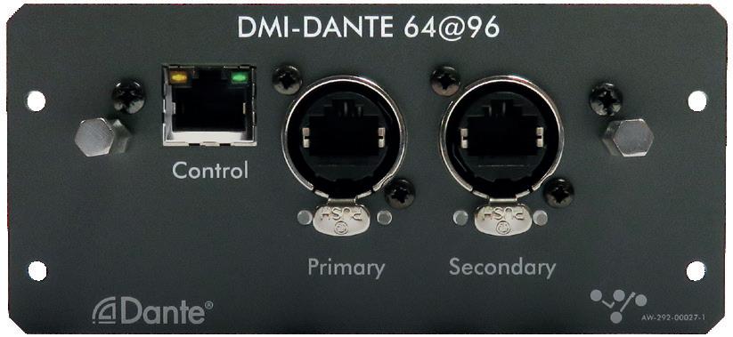 This card provides 64 input and 64 output channels at both 48KHz and 96KHz. It is provided with Primary and Secondary (backup) Gigabit Ethernet ports for connection to the Dante network.