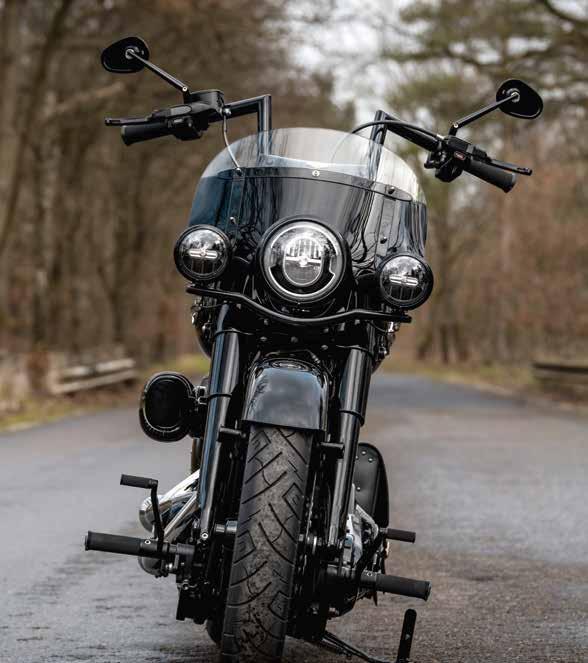 Die Airride Zylinder suggerieren durch ihre spitzen Enden Macht und Aufsehen. Ihr Owner hat alle wichtigen Informationen auf einen Blick im gewohnten Display, denn hier sind die Aussparungen für den originalen FXBB-Tacho ausgelegt. Der „Radical“-Lenker braucht keine Riser. Er lässt sich wie aus einem Guss an der „Radical“Gabel montieren.