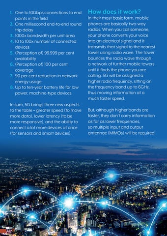 1. One to 10Gbps connections to end points in the field 2. One millisecond end-to-end round trip delay 3. 1000x bandwidth per unit area 4. 10 to 100x number of connected devices 5. (Perception of) 99.999 per cent availability 6. (Perception of) 100 per cent coverage 7. 90 per cent reduction in network energy usage 8. Up to ten-year battery life for low power, machine-type devices In sum, 5G brings three new aspects to the table – greater speed (to move more data), lower latency (to be more responsive), and the ability to connect a lot more devices at once (for sensors and smart devices).
