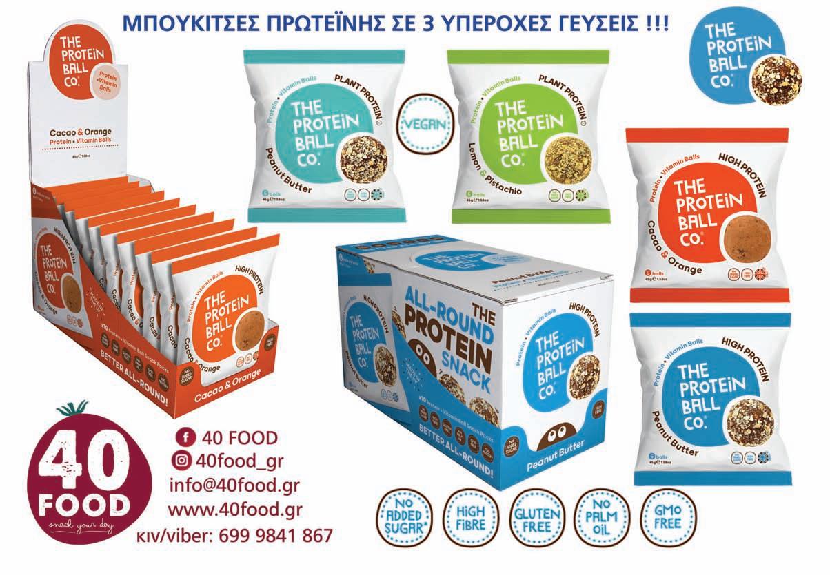 rotein Ball Co, επειδή δεν ψήνονται, διατηρούν αναλλοίωτα όλα τα μικρο-συστατικά τους. Μ ΜΠΟΥΚΊΤΣΕΣ ΠΡΩΤΕΐΝΗΣ ΣΕ 3 ΛΑΧΤΑΡΊΣΤΕΣ ΓΕ Υ ΣΕΊΣ Η 40FOOD είναι μία εταιρεία που έχει βασικό της στόχο να ενθαρρύνει τον κόσμο να κάνει υγιεινές επιλογές στο snacking, κι η νέα της πρόταση αφορά τα «The Protein Ball Co». infopoint THE PROTEIN BALL Co ΥΓΙΕΙΝΌ ΣΝΑΚ ΠΡΩΤΕΐΝΗΣ