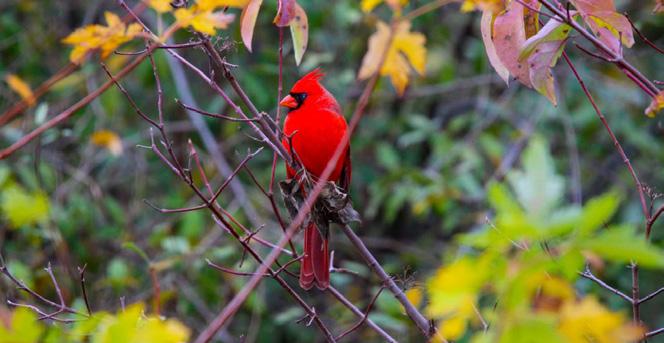 red male cardinal in the trees exemplifies that the DSLR is the better choicetothistypeofphoto.