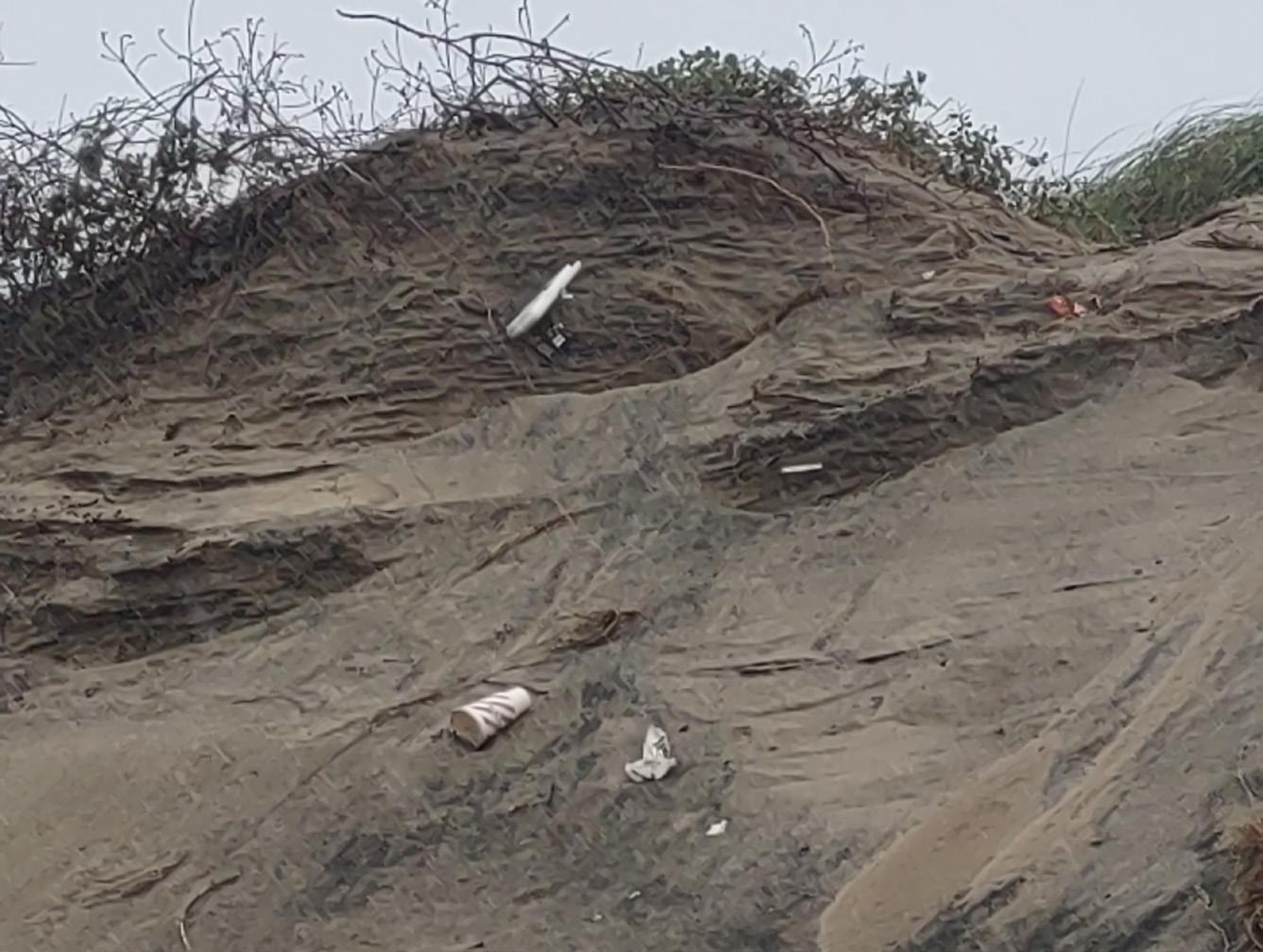[Trashblownintothesanddunes/CourtesyphotoPatriciaM.McGrath]Togodebrisfromlocal restaurantsareleftonourbeachesandblowintothesanddunes,causingpossibledangerto local wildlife.