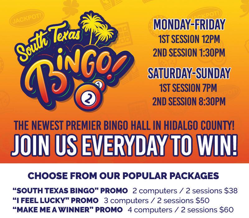 40 Hidalgo County’s Readers’ Choice Awards September 2023 myRGV.com THE MONITOR thanks for voting us thank Y ou for voting us th E M onitor r E a DE r ’ s C hoi CE #1 go L f C ours E for 16 YE ars f ro M 2005 to 2023 CALL FOR TEE TIME! 956.316.0444 1720 South Raul Longoria Rd., Edinburg, TX 78539 EXPERIENCE Natural Beauty! 18 Holes/ 7,100 Yards/ Par 72 Las Lagos Golf Club, a spectacular design Masterfully done by world wide architect Robert von Hagge. ENJOY NIGHT BINGO DAILY SUNDAY THROUGH SATURDAY Now Open at 5pm Sessions Begin at 7 & 8:30pm Thank You For Voting Us “Your Favorite Bingo Hall”