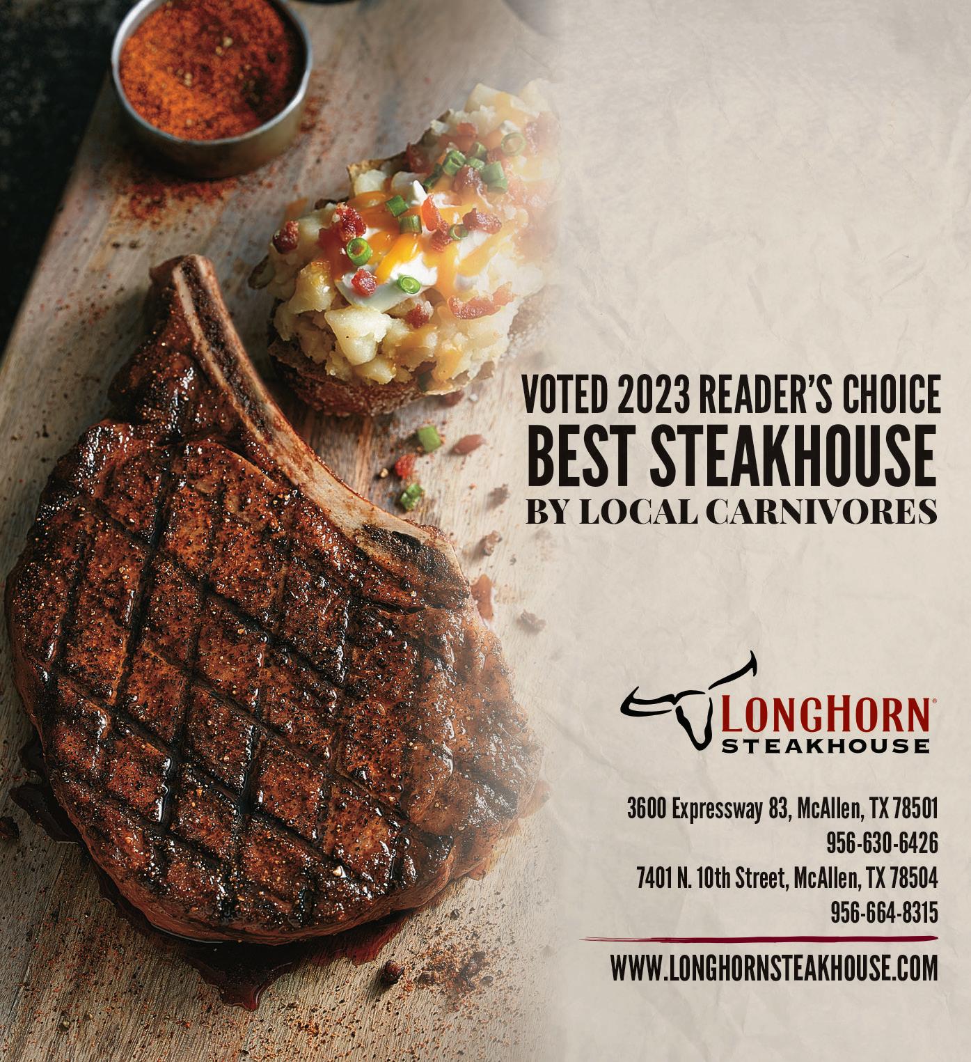 S. 5th Street | Suite 209 | McAllen, TX 78503 TO MAKE AN APPOINTMENT: Schedule online at sthsclinics.com or call 956-731-0504 Monday through Friday, 8 a.m. – 5 p.m. CONGRATULATIONS TO YOUR CHOICE FOR PAIN MEDICINE CLINIC 1221 N. Main Street, McAllen, TX 956-664-9003 Exprience, Love, Patience and Profesional Care Tuesday- Saturday 9 a.m. - 2 p.m. • Walk-ins: 9 a.m. - 11 a.m. daily Thank you for voting us your Favorite Pet Grooming/Kennel Groom All Sizes All Breeds Welcome FAVORITE STEAKHOUSE VOTED 2023 READERS’ CHOICE Favorite Martial Arts School Readers’ 2023 We would like to thank all the families, students, and the local communities for your continued support and Voting us as your Favorite Martial Arts school for the last 5 consecutive years. *Children, Teen & Adult Classes Available 2009 Industrial Dr. McAllen 78504 FOLLOW US ON FACEBOOK (956) 682-8079