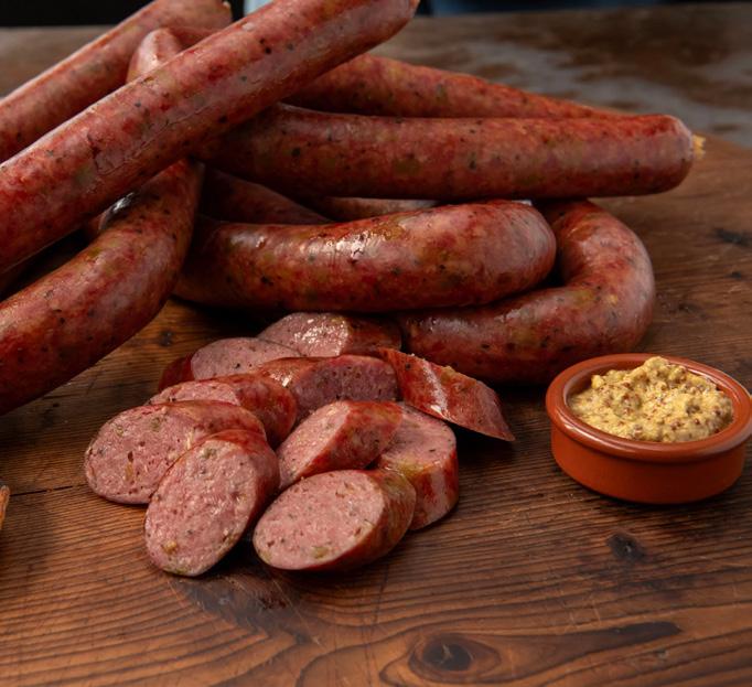 Introducing our newest favorite: Smoked Beef Sausage with Green Chile. Our sausage is crafted from 100% premium beef brisket and mesquite smoked to mouthwatering perfection. Each link delivers a smoky, savory bite with just the right kick of green chile heat and a satisfying snap in every bite.