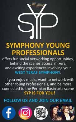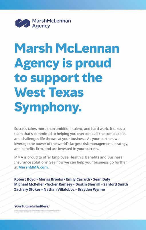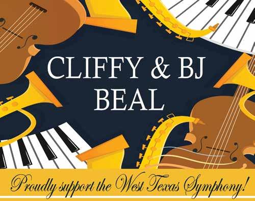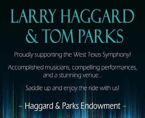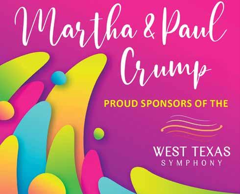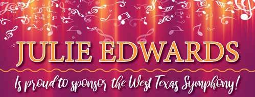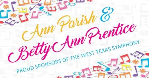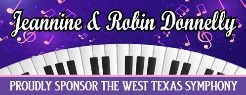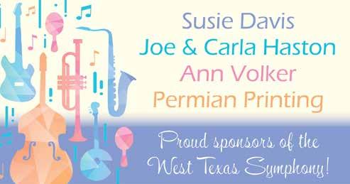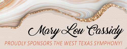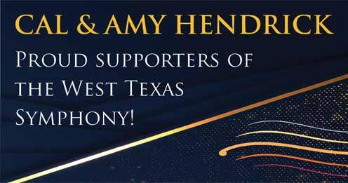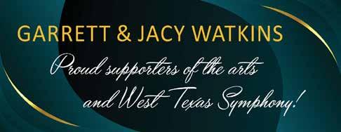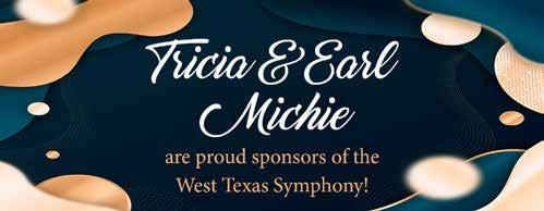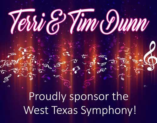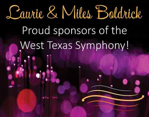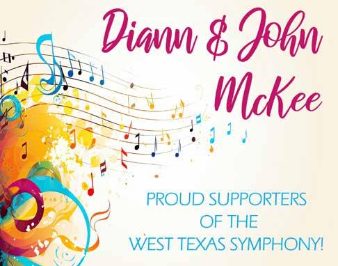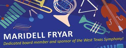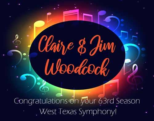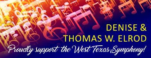 As we celebrate this 63rd season, the Board of Directors thanks our sponsors, donors and patrons. Sixty-three years is a long time to survive in this fragile world of symphonic music. Because of your support, the West Texas Symphony is strong and looking forward to another incredible year. Music is a pathway to deepening our curiosity and connecting us to our world and to each other. We are glad you are with us on that journey.
