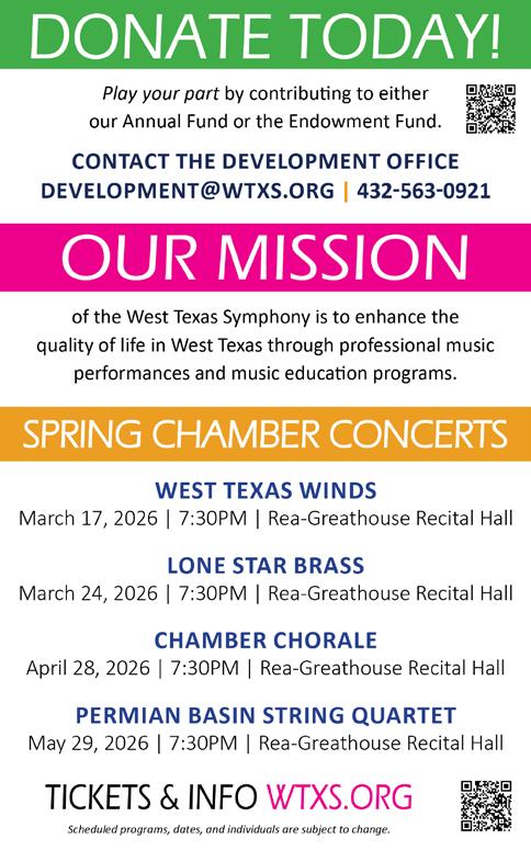 The mission of the West Texas Symphony is to enhance the quality of life in West Texas through music performance and music education. Like tonight’s concert, our mission affect is nuanced, immense, and can often be powerful and challenging to comprehensively unpack through words in a program book! Simply, if you enjoyed tonight’s concert, I strongly encourage you to explore more ways to engage with your West Texas Symphony. Follow us on social media, visit wtxs.org, visit us in the lobby, or follow your favorite musicians on social media. Also, know that a majority of our financial support comes from generous gifts and donations. If you have generously donated to ensure the financial health of the West Texas Symphony, thank you! To learn more about ways to financially support your West Texas Symphony Orchestra, please visit Development Director, Violet Singh, in the lobby, visit wtxs.org, or call 432-563-0921.