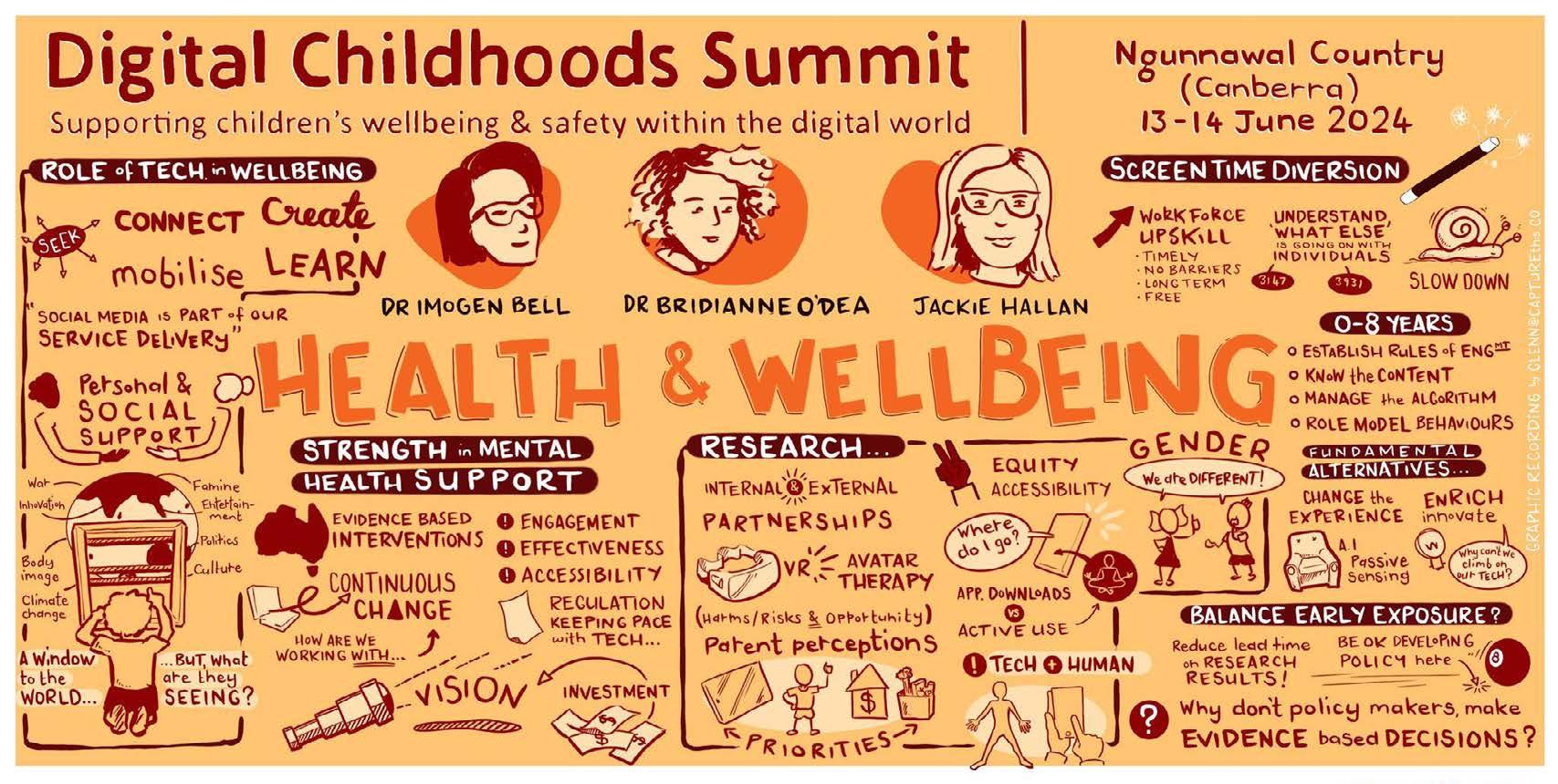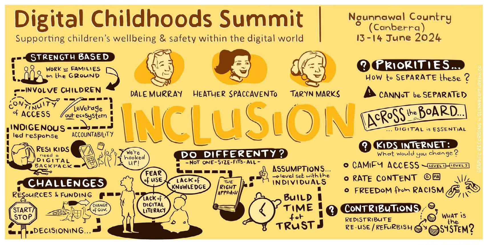 This report draws on discussions at the Digital Childhoods Summit, which was held in Canberra on June 13-14 in 2024. The Summit focused in on the themes of safety, inclusion, health & wellbeing, and futures during two days in Canberra. Reflections from each component are incorporated in this report.