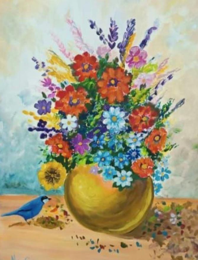 Bodegón de flores con ave endémica Acrílica s/lienzo 50 x 70 cm - 2022