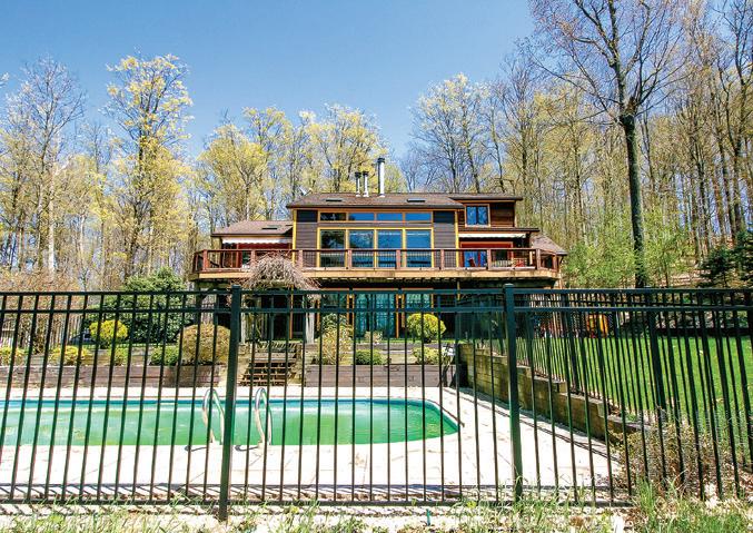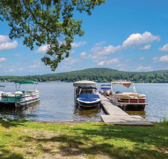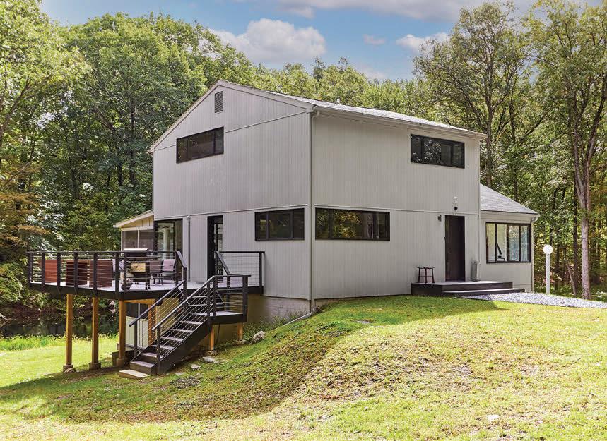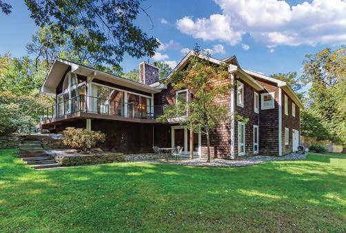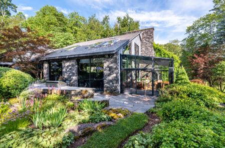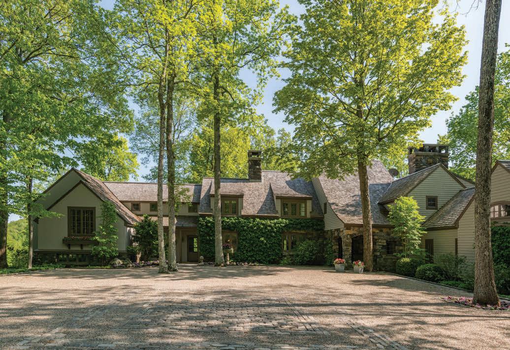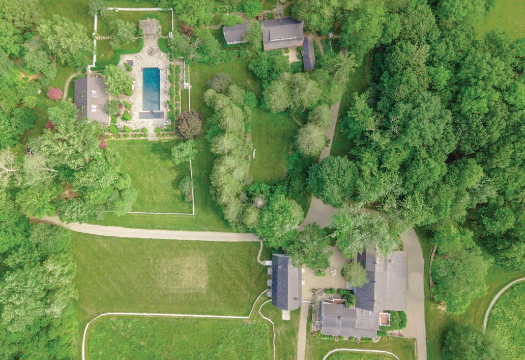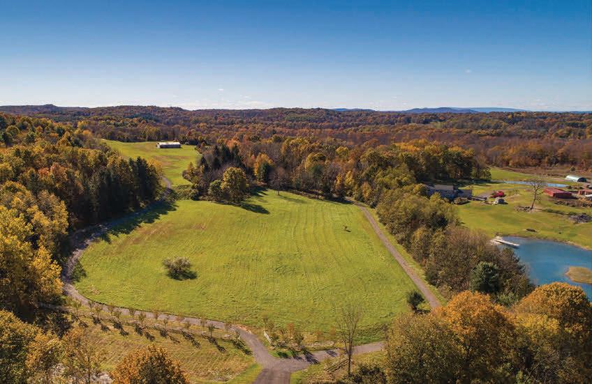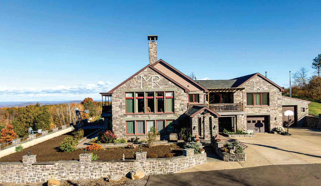 Spacious 7 bedroom, 6 bathroom, stone-andwood home surrounded by artfully designed stonework and lush landscaping. Great room with fireplace, chef’s kitchen, and 4 season sun-room. Grotto-like swimming pool with multi-level terraces and outdoor kitchen. Past the stocked pond is the horse stable with a fenced-in pasture, and a 3,600 square foot heated hangar. 2,200 ft of lake frontage, trails throughout the wooded hillside, and a private island. COPAKE, NY $7,950,000
