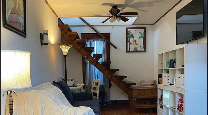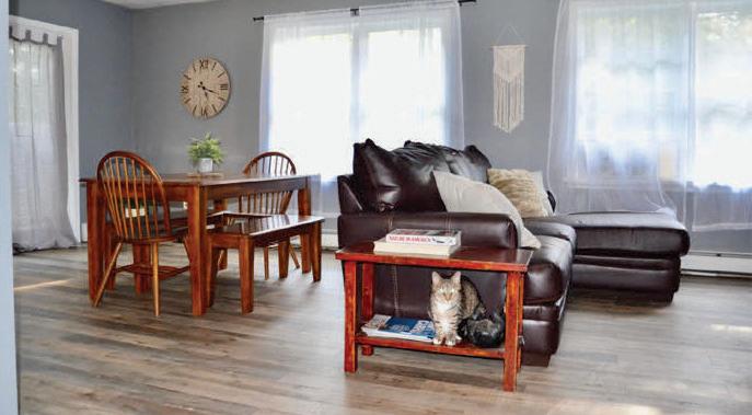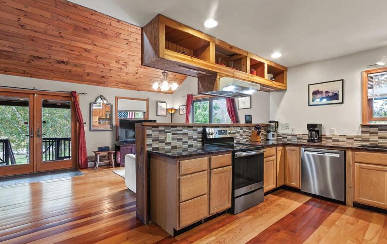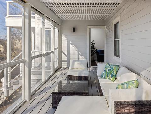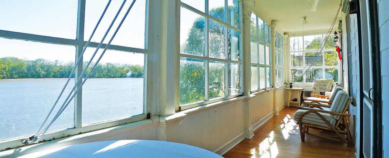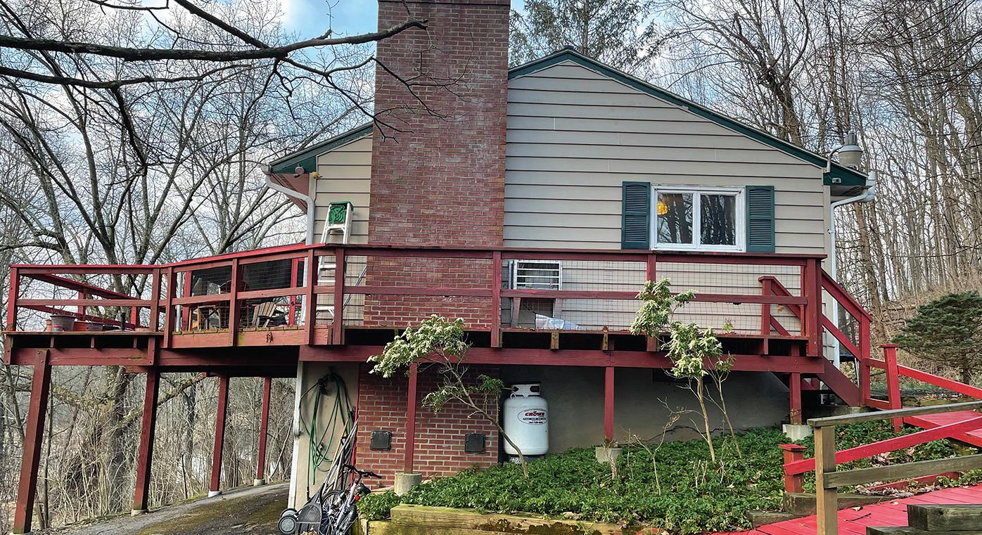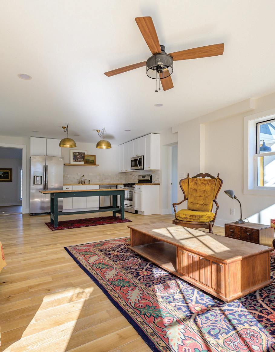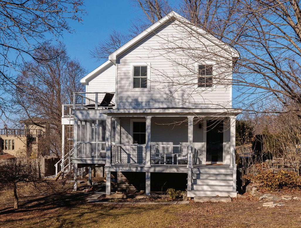 Germantown Riverview. Four Disher Lane is in Cheviot, a Hamlet of Germantown, on the banks of the Hudson River. is house has undergone a complete recon guration and renovation, using the best building materials. e design works with the location taking advantage of the amazing views of the Hudson River and the Catskills beyond. ere are decks o the second level on the North and West sides. e smart, bright, open oor plan encompasses the kitchen-dining-living area. e primary suite is on this oor as well and has its own deck. e rst oor has a guest bedroom and a second bedroom/o ce, a screened-in porch, and access to the two-car garage.