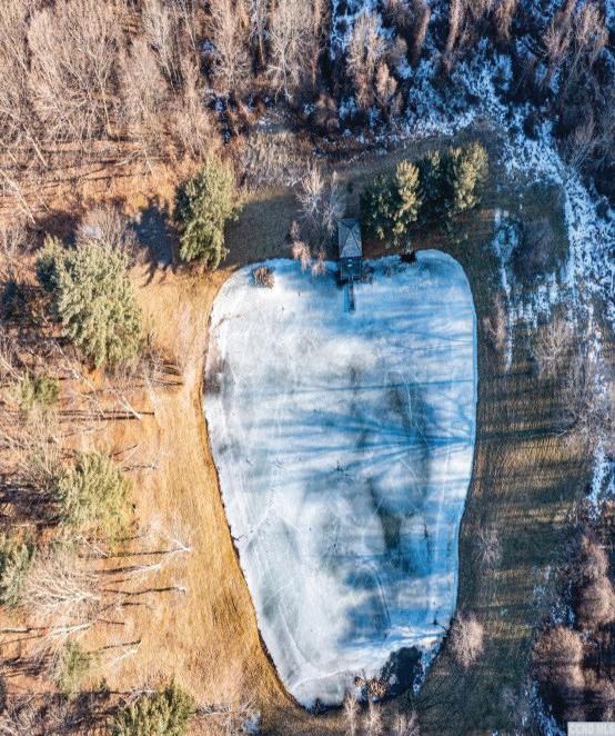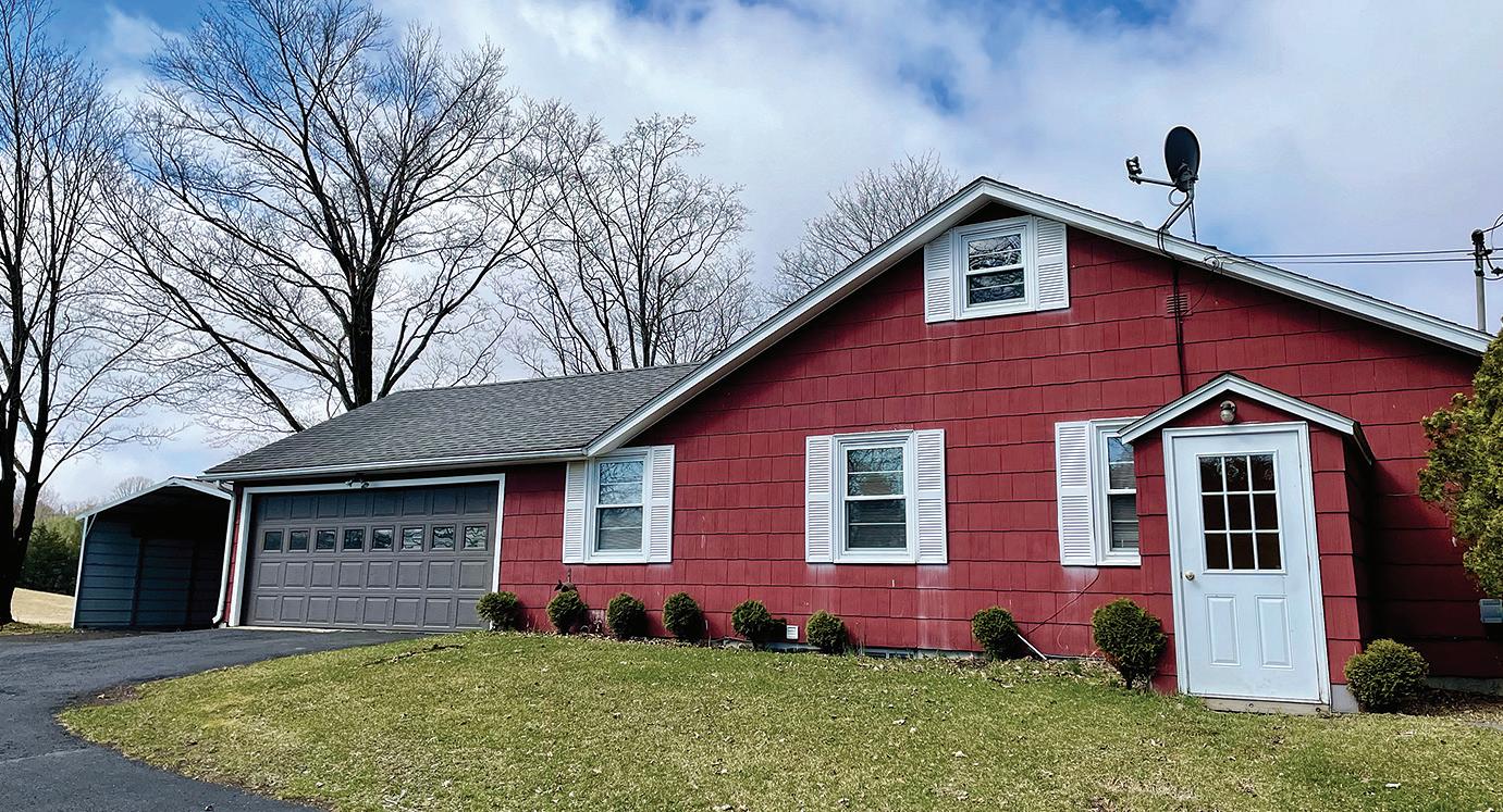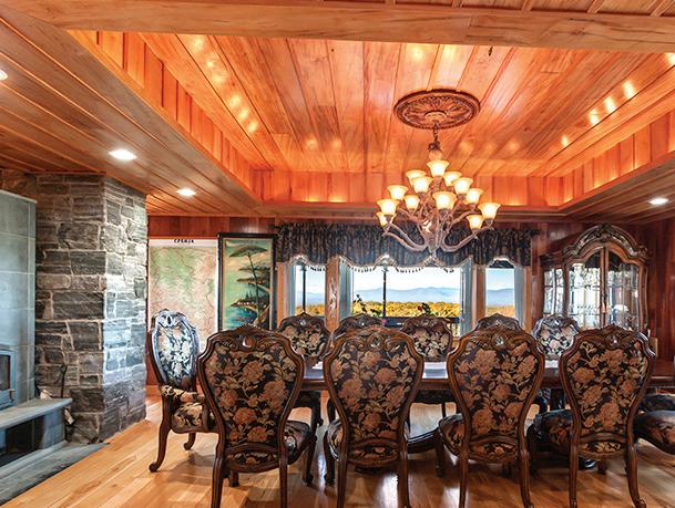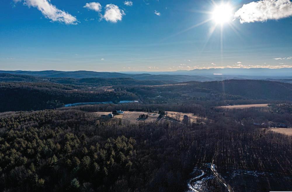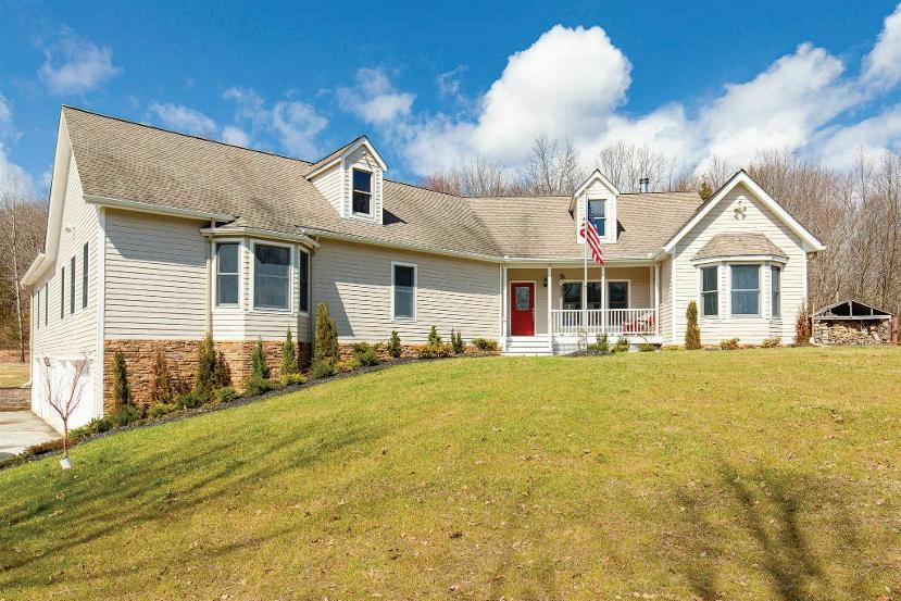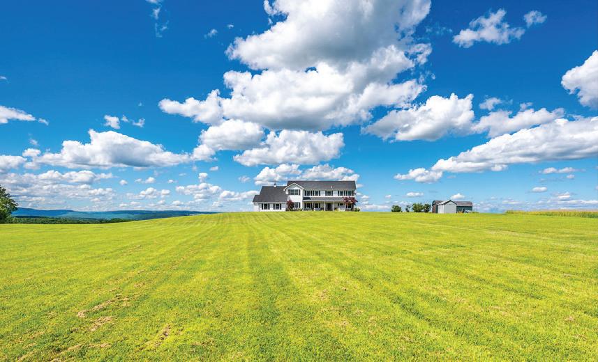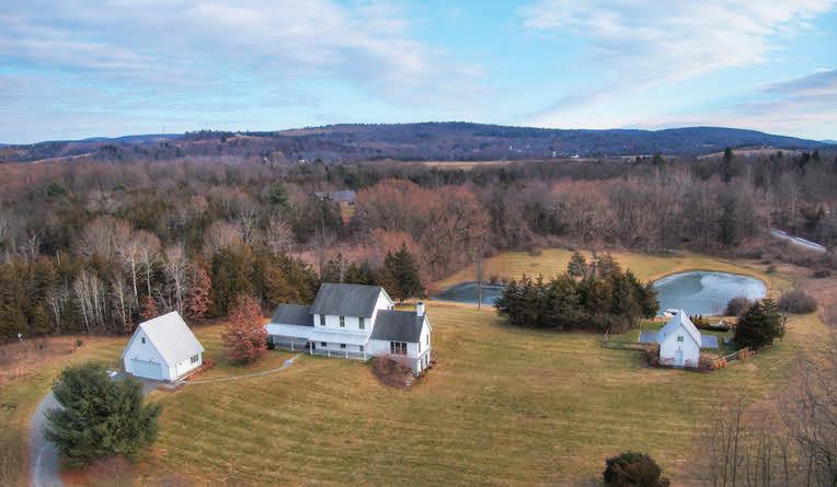 Dramatic panoramic views from this secluded Contemporary on 108 acres. e views include the full range of the Catskill Mountains to the west, the Taconic Range and Stissing Mountain to the east and the Hudson Valley to the south. e custom-built home features 3,700 sq of living area with a cathedral-ceilinged living room and a tile ceilinged dining room both with amazing views, a spacious kitchen with an informal dining area and direct access to the balcony, primary bedroom suite with two walk-in closets, and a large bath. e ground oor includes 2 bedrooms, a den, full bath and a spa room with hot tub and shower. e majority of the rooms have cherry or maple paneling, all the closets are cedar lined, oors are hickory wide-board or ceramic tile, with central air throughout. e improvements also include 2 attached garages and a barn. e land features a nice size pond and a number of elds perfect for farming.