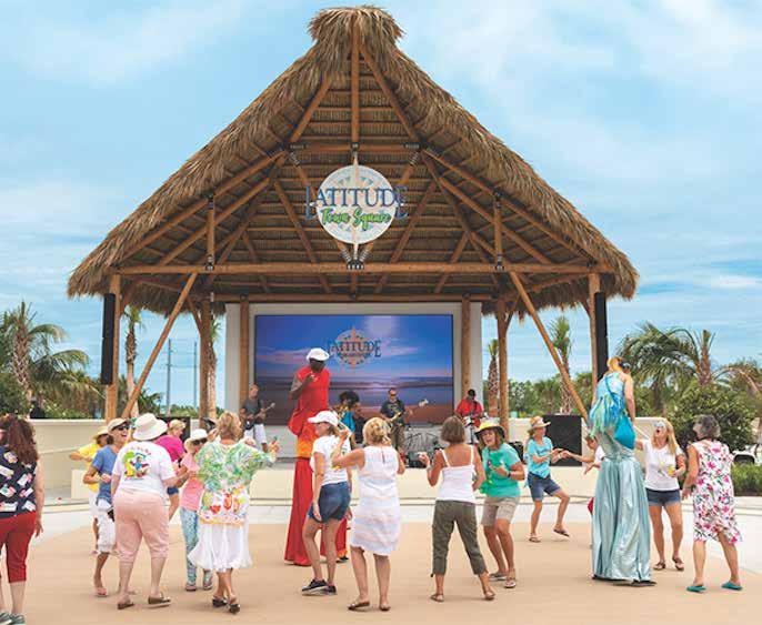 Expect themed amenities, such as the Latitude Town Square (with a bandshell that hosts live music), Last Mango Theater, Barkaritaville Pet Spa, Latitude Bar & Chill Restaurant, Changes in Attitude Bar, and Paradise Pool with beach entry, cabanas and tiki huts. Also, there’s a fully outfitted gym with a Spin Room, indoor whirlpool spa and lap pool.