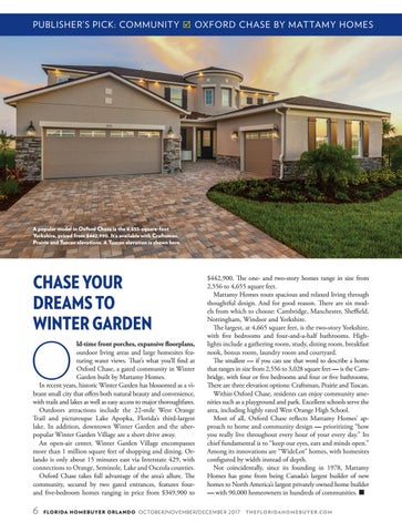 ld-time front porches, expansive floorplans, outdoor living areas and large homesites featuring water views. That’s what you’ll find at Oxford Chase, a gated community in Winter Garden built by Mattamy Homes. In recent years, historic Winter Garden has blossomed as a vibrant small city that offers both natural beauty and convenience, with trails and lakes as well as easy access to major thoroughfares. Outdoors attractions include the 22-mile West Orange Trail and picturesque Lake Apopka, Florida’s third-largest lake. In addition, downtown Winter Garden and the uberpopular Winter Garden Village are a short drive away. An open-air center, Winter Garden Village encompasses more than 1 million square feet of shopping and dining. Orlando is only about 15 minutes east via Interstate 429, with connections to Orange, Seminole, Lake and Osceola counties. Oxford Chase takes full advantage of the area’s allure. The community, secured by two gated entrances, features fourand five-bedroom homes ranging in price from $349,900 to