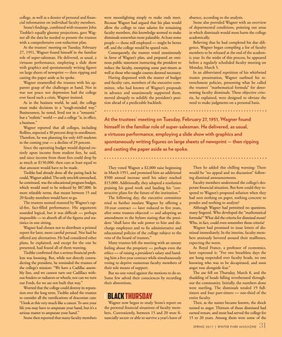 absence, according to the analysis. Stone also provided Wagner with an overview of departmental conditions, pointing out areas in which dismissals would most harm the college academically. Believing that he had completed his due diligence, Wagner began compiling a list of faculty members to be released at the end of the academic year. In the midst of this process, he appeared before a regularly scheduled faculty meeting on Monday, March 5. In an abbreviated repetition of his whirlwind trustee presentation, Wagner outlined his retrenchment policies, presenting what he called the trustees’ “mathematical formula” for determining faculty dismissals. These objective criteria, he explained, were designed to obviate the need to make judgments on a personal basis.