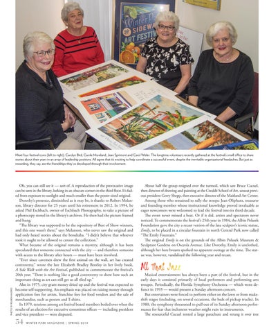 Oh, you can still see it — sort of. A reproduction of the provocative image can be seen in the library, lurking in an obscure corner on the third floor. It’s faded from exposure to sunlight and much smaller than the poster-sized original. Dorothy’s presence, diminished as it may be, is thanks to Robert Melanson, library director for 25 years until his retirement in 2012. In 1994, he asked Phil Eschbach, owner of Eschbach Photography, to take a picture of a photocopy stored in the library’s archives. He then had the picture framed and hung. “The library was supposed to be the repository of Best of Show winners, and this one wasn’t there,” says Melanson, who never saw the original and had only heard stories about the brouhaha. “I didn’t believe that whoever took it ought to be allowed to censor the collection.” What became of the original remains a mystery, although it has been speculated that someone connected with the city — and therefore someone with access to the library after hours — must have been involved. “Ever since cavemen drew the first animal on the wall, art has created controversy,” wrote the late Elizabeth Bradley Bentley in her lively book, A Side Walk with the Art Festival, published to commemorate the festival’s 20th year. “There is nothing like a good controversy to show how such an important thing as art can still get us all riled up.” Also in 1975, city grant money dried up and the festival was expected to become self-supporting. An emphasis was placed on raising money through application fees for artists, franchise fees for food vendors and the sale of merchandise, such as posters and T-shirts. In 1979, tensions among art festival board members boiled over when the results of an election for executive committee offices — including president and vice president — were disputed.