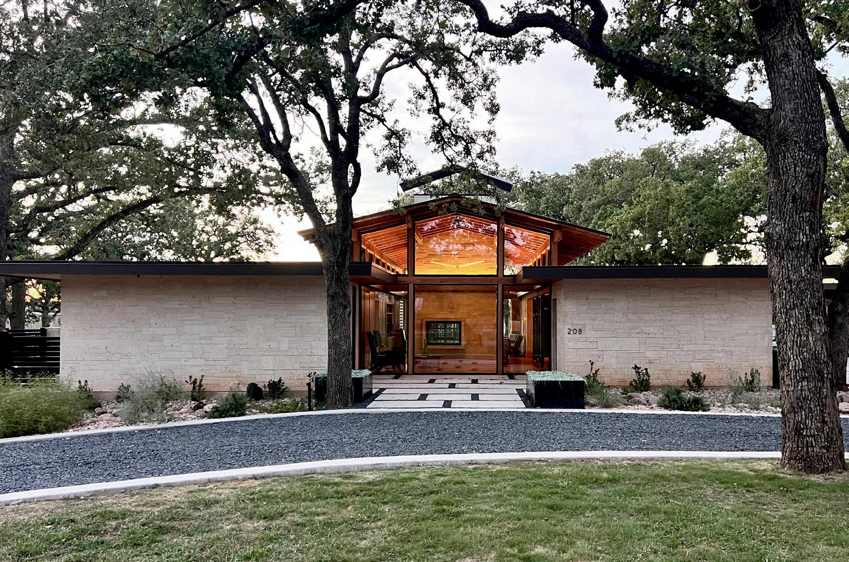 • Items saved from the original structure include the D’hanis terracotta tile flooring, the yellow glass partition in the entry way, the posts and beams framing the elevated center living space, the exterior limestone rock and the front door.