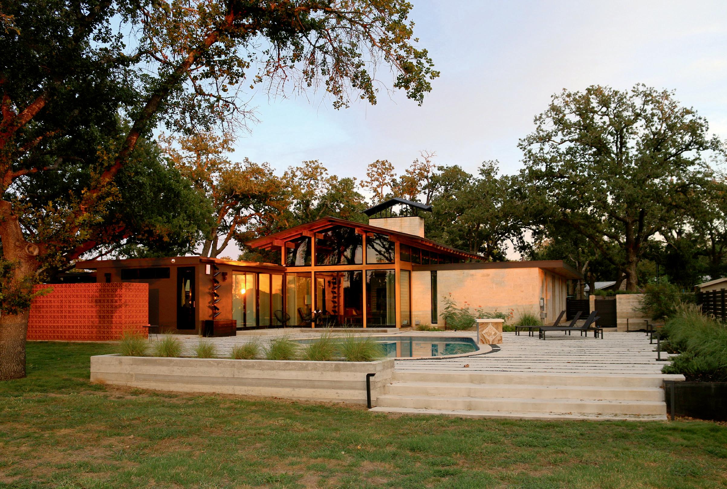 • Board-formed concrete stem walls, a new concrete pool deck around the original pool and integrated concrete pavers tie the exterior spaces together and highlight the one-of-a-kind fountain in the front yard.