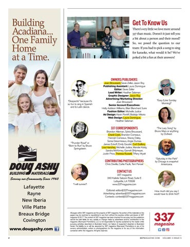 337 magazine 340 Kaliste Saloom Road, Suite E Lafayette, LA 70508 www.337magazine.com Editorial: editor@337magazine.com Advertising: advertise@337magazine.com Contests: contest@337magazine.com