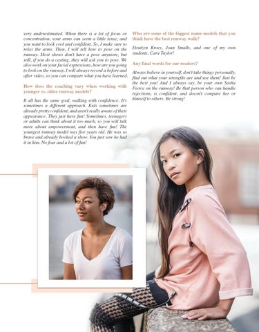 very underestimated. When there is a lot of focus or concentration, your arms can seem a little tense, and you want to look cool and confident. So, I make sure to relax the arms. Then, I will tell how to pose on the runway. Most shows don't have a pose anymore, but still, if you do a casting, they will ask you to pose. We also work on your facial expressions, how are you going to look on the runway. I will always record a before and after video, so you can compare what you have learned. How does the coaching vary when working with younger vs. older runway models? It all has the same goal, walking with confidence. It's sometimes a different approach. Kids sometimes are already pretty confident, and aren't really aware of their appearance. They just have fun! Sometimes, teenagers or adults can think about it too much, so you will talk more about empowerment, and then have fun! The youngest runway model was five years old. He was so brave and already booked a show. You just saw he had it in him. No fear and a lot of fun!